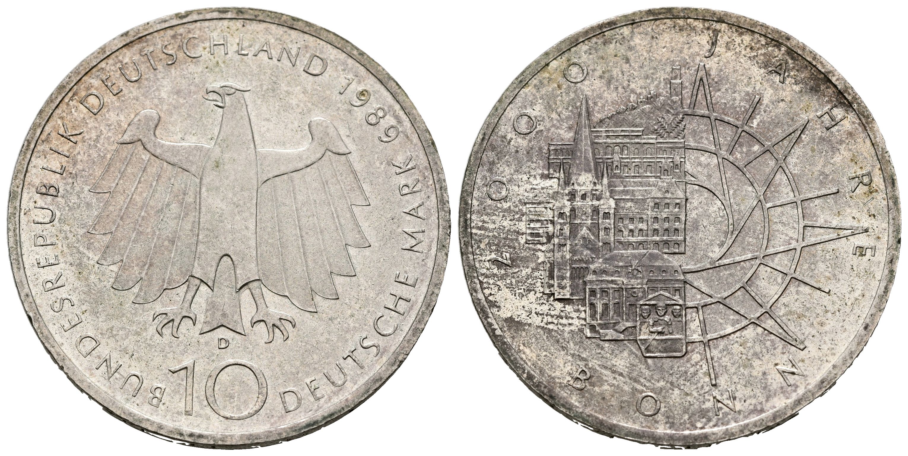 ALEMANIA. 10 Marcos (Ar. 15,60g/33mm). 1989. Munich D. 2000 Aniversario de la ciudad de Bonn. (Km#172). EBC-. Pátina.