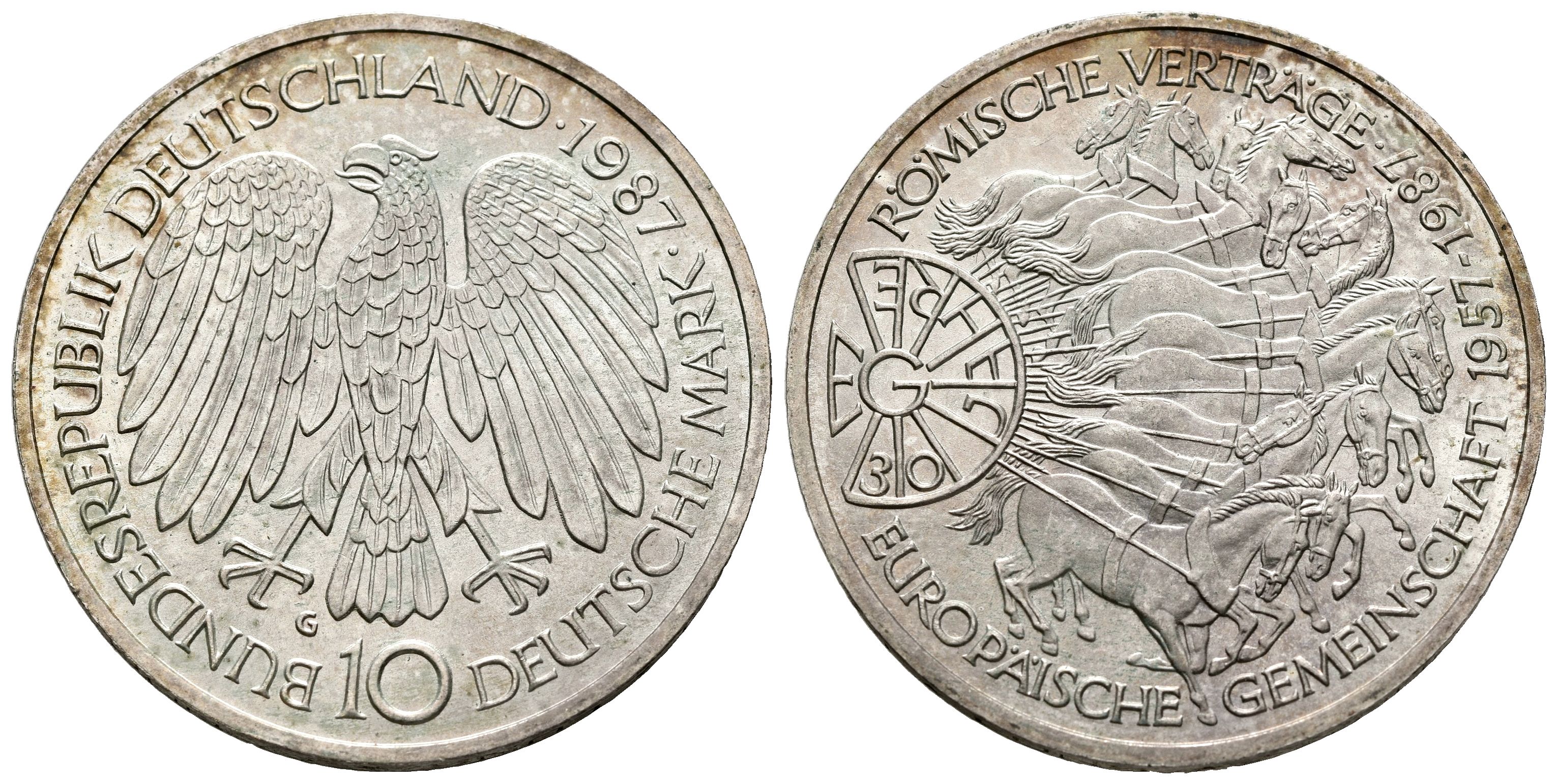 ALEMANIA. 10 Marcos (Ar. 15,54g/33mm). 1987. Karlsruhe G. 30 Aniversario de la Firma del Tratado de Roma. (Km#167). EBC.