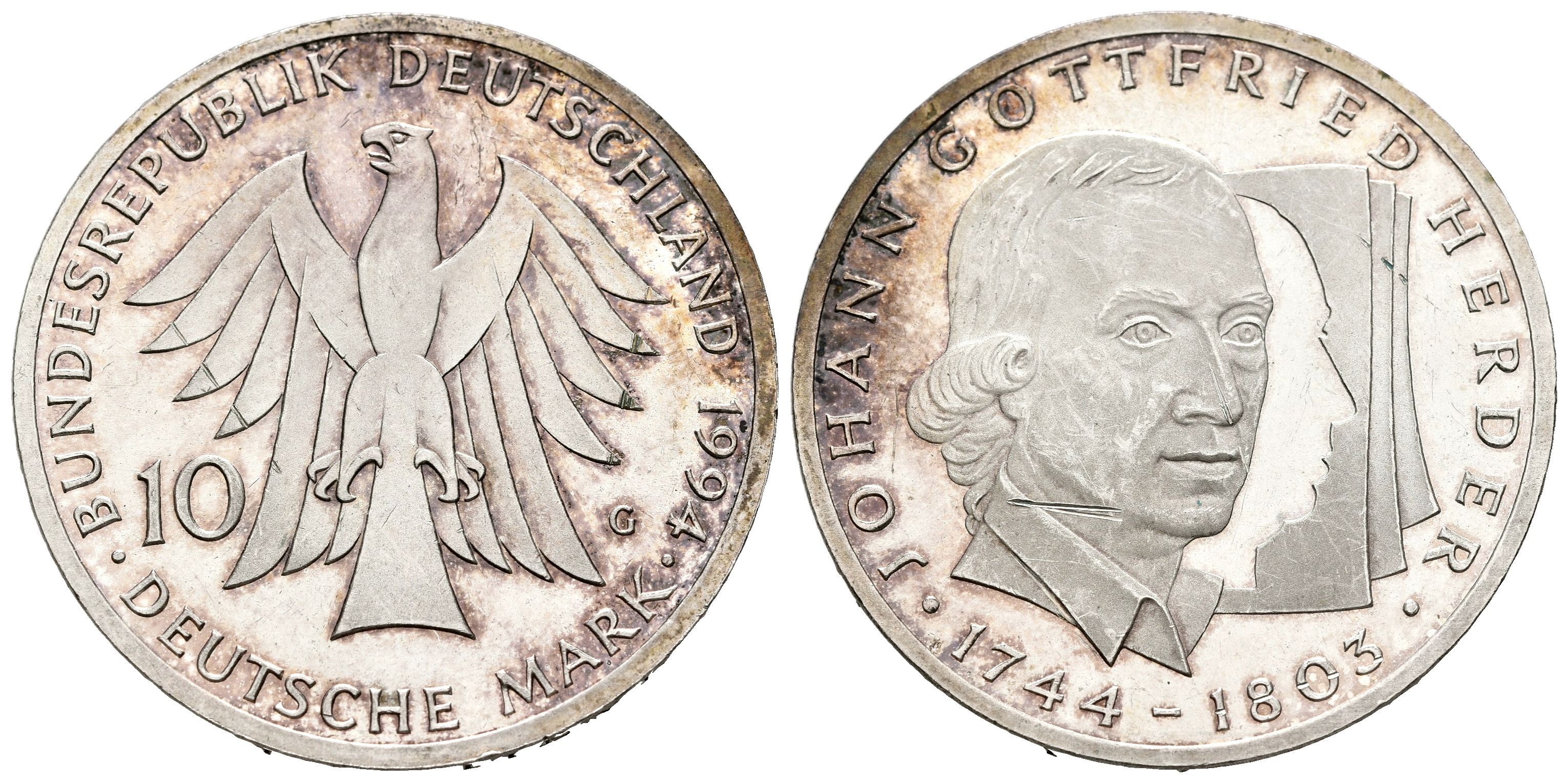 ALEMANIA. 10 Marcos (Ar. 15,60g/33mm). 1994. Karlsruhe G. 250 Aniversario del nacimiento de Johann Gottfried Herder. (Km#184). EBC-. Rayas.