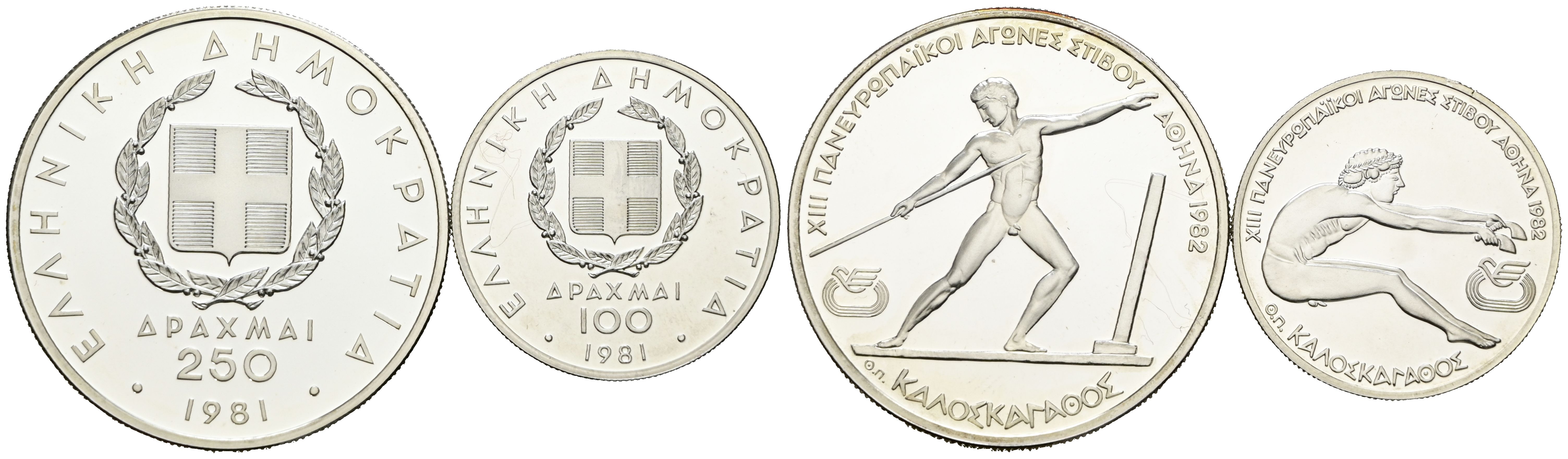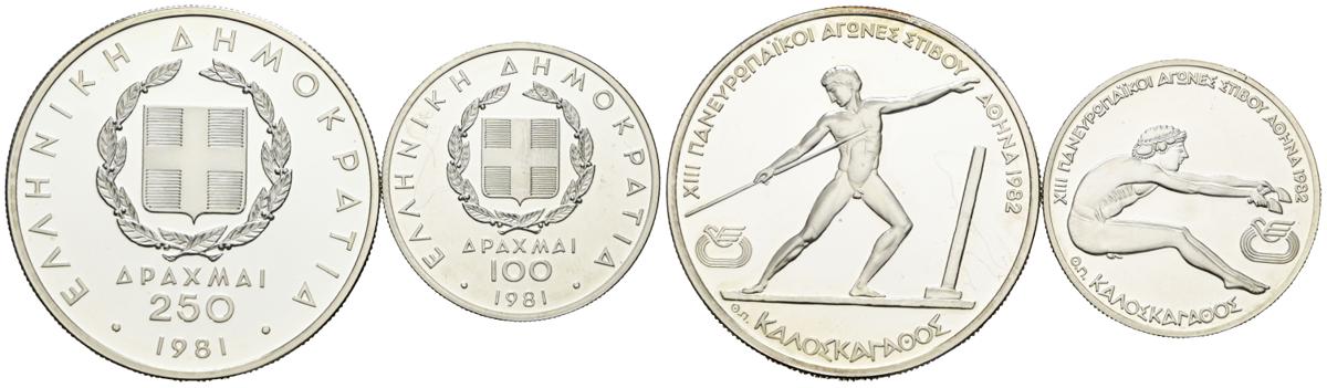 GRECIA. Pareja de 100 y 250 Dracmas en plata. 1981. Juegos Paneuropeos. SC. A EXAMINAR.
