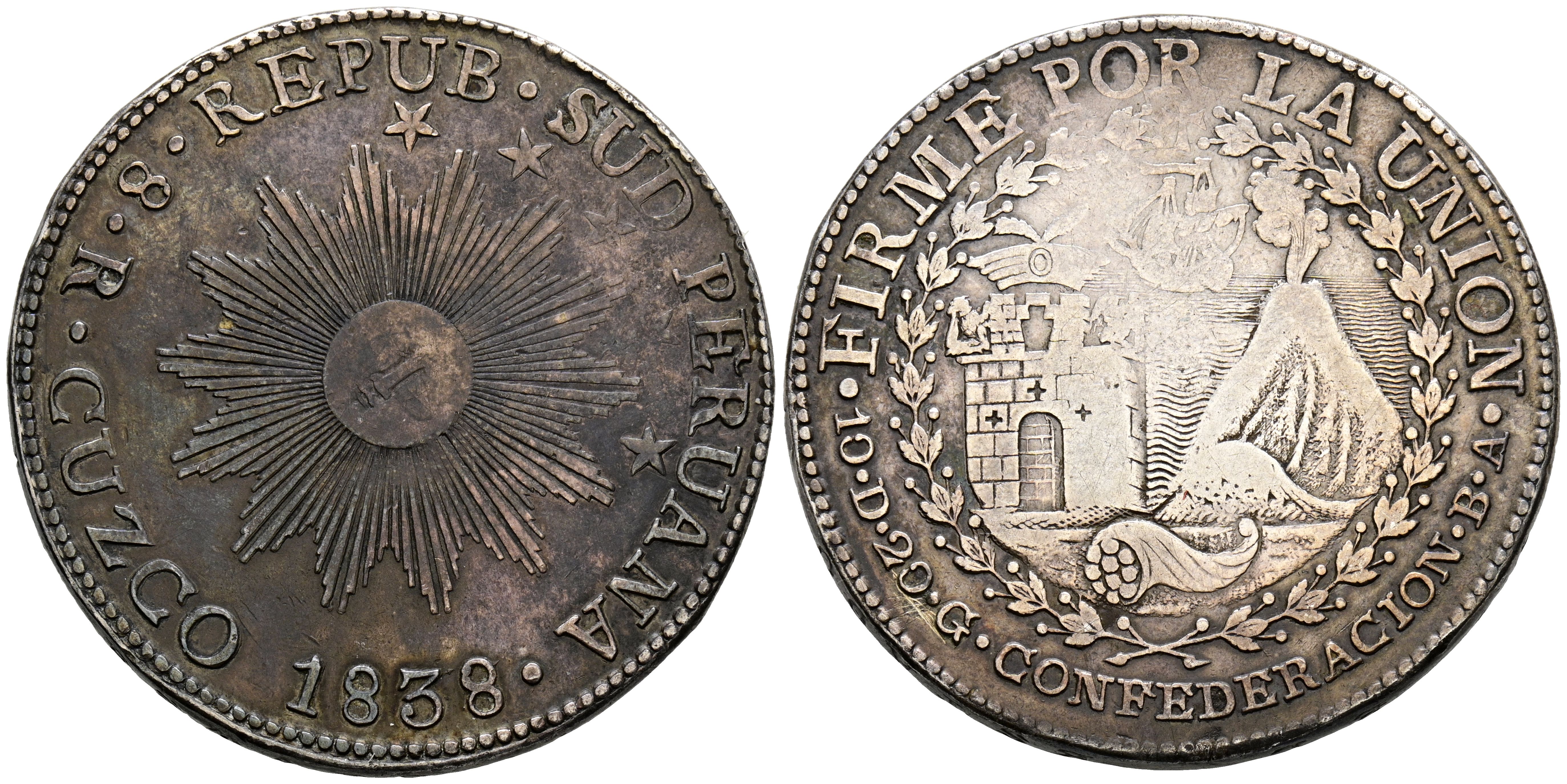 PERU, República Sud Peruana. 8 Reales. (Ar. 26,65g/39mm). 1838. Cuzco BA. (Km# 170.4). MBC+. Vanos de acuñación. Bonita pátina. Escaso ejemplar.