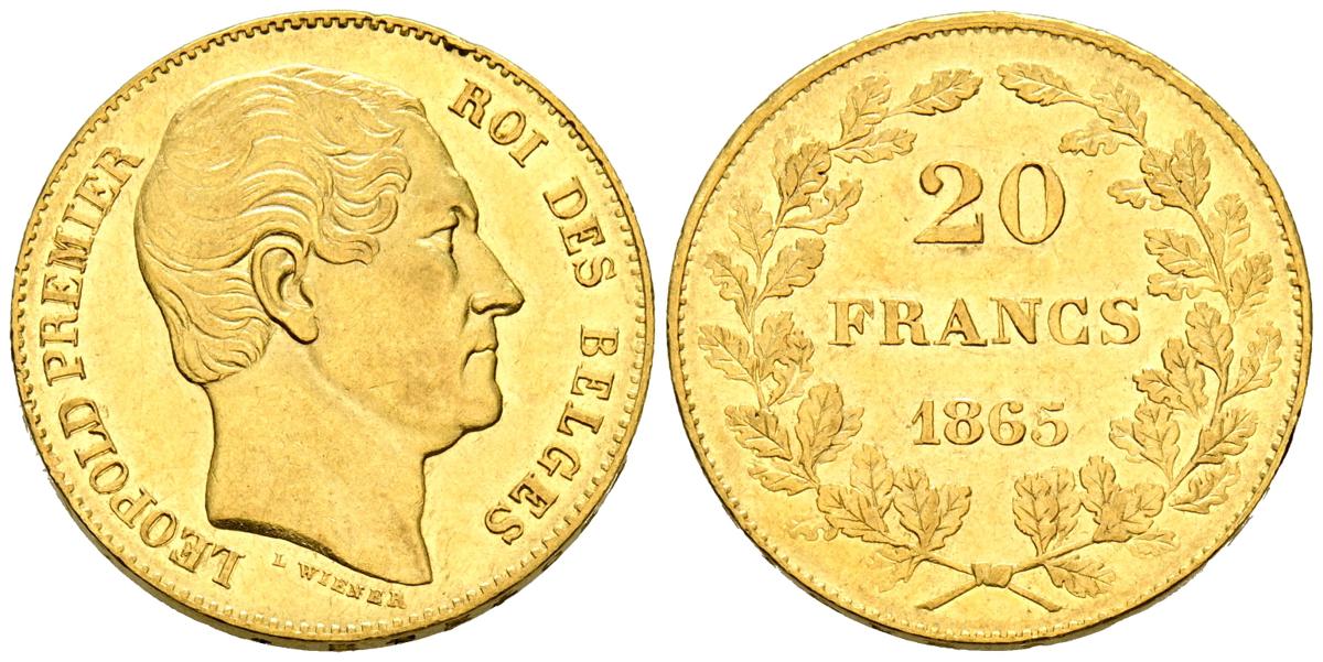 BELGICA, Leopoldo I (1831-1865). 20 Francos. (Au. 6,43g/21mm). 1865. Bruselas. (Km#23). EBC-.