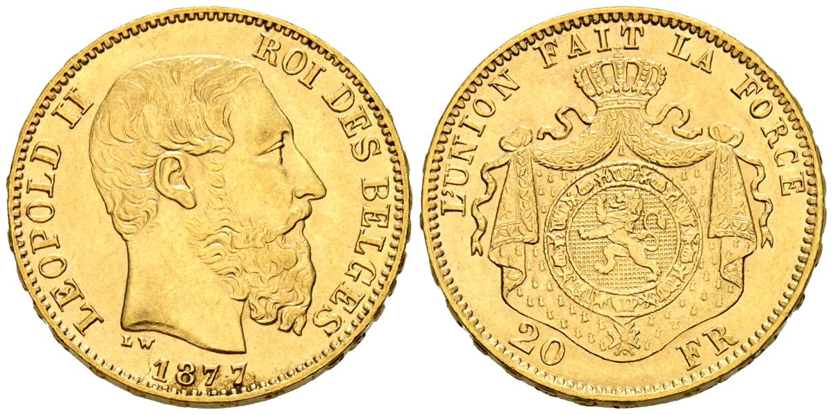 BELGICA, Leopoldo II (1865-1909). 20 Francos. (Au. 6,45g/21mm). 1877. Bruselas. (Km#37). MBC+.
