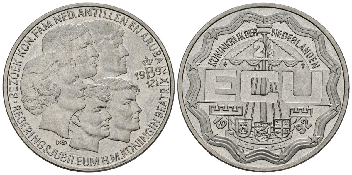 HOLANDA. 2 1/2 Ecu. 1992. VISITA REAL A LAS ANTILLAS HOLANDESAS. CuNi. 15,48g. SC.