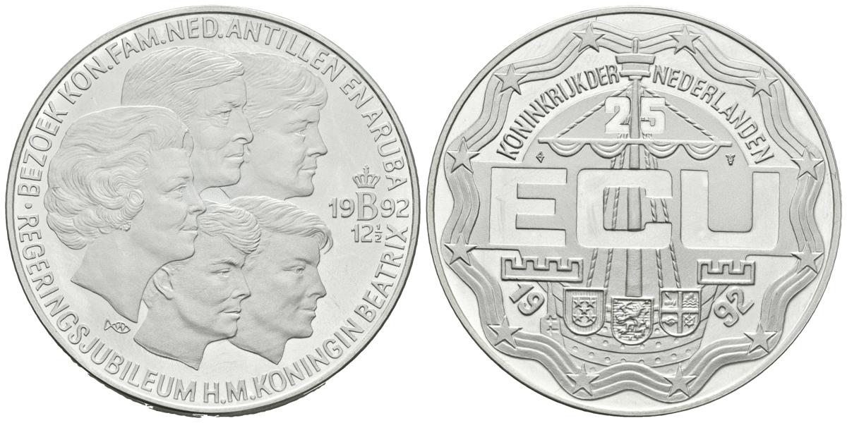 HOLANDA. 25 Ecu. 1992. VISITA REAL A LAS ANTILLAS HOLANDESAS. Ar. 25,18g. PROOF.
