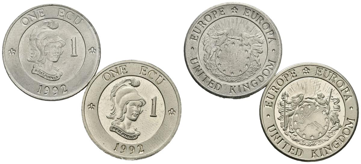 REINO UNIDO. Conjunto de 2 monedas de 1992, conteniendo: 1 Ecu y 1 Ecu (piedfort). CuNi. SC.