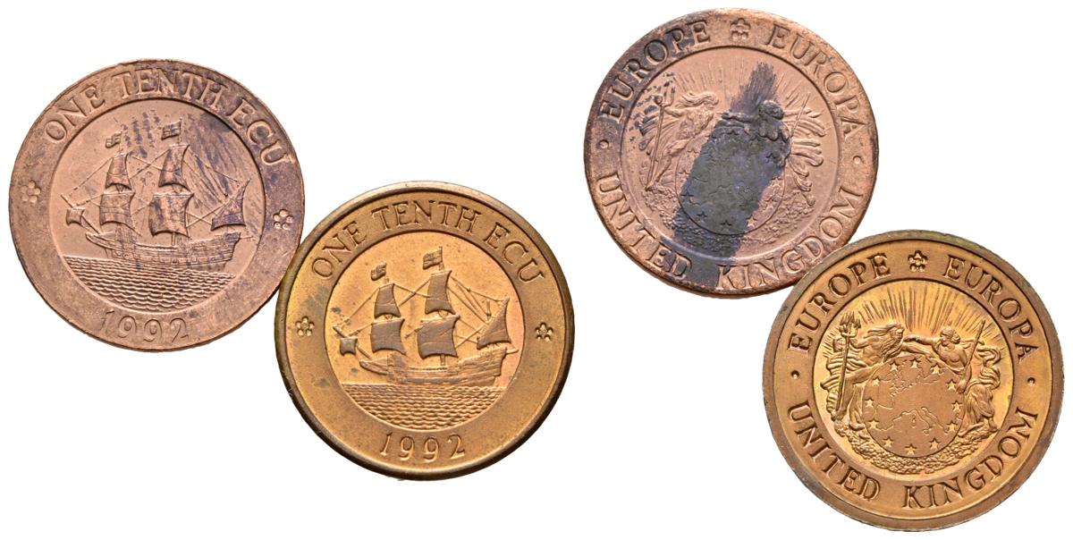 REINO UNIDO. Conjunto de 2 monedas de 1992, conteniendo: 1/10 Ecu y 1/10 Ecu (piedfort). La. SC.