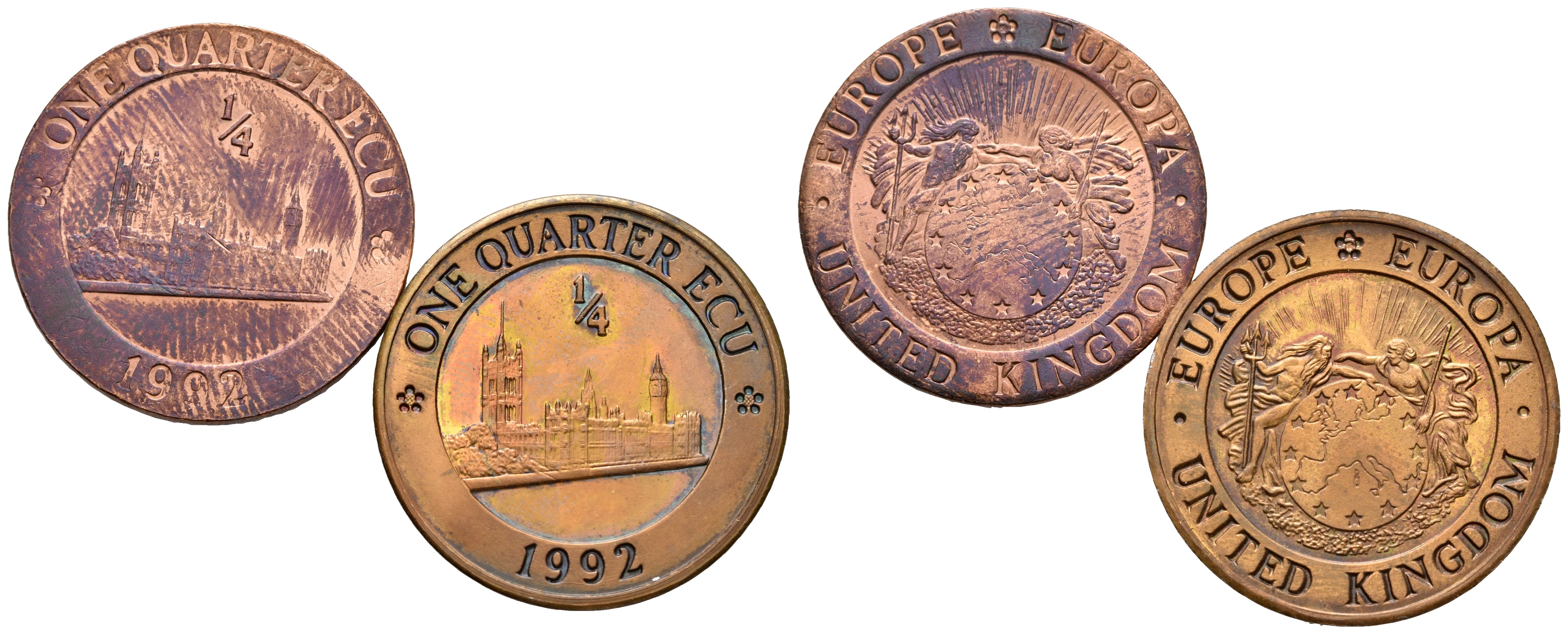 REINO UNIDO. Conjunto de 2 monedas de 1992, conteniendo: 1/4 Ecu y 1/4 Ecu (piedfort). La. SC.