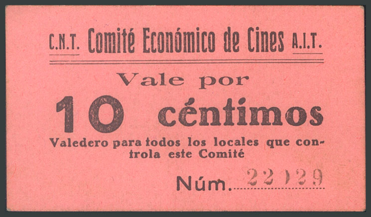 COMITE ECONOMICO DE CINES. Vale por 10 Céntimos, servía para todos los locales de este comité. EBC.