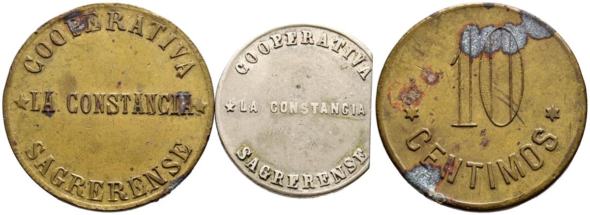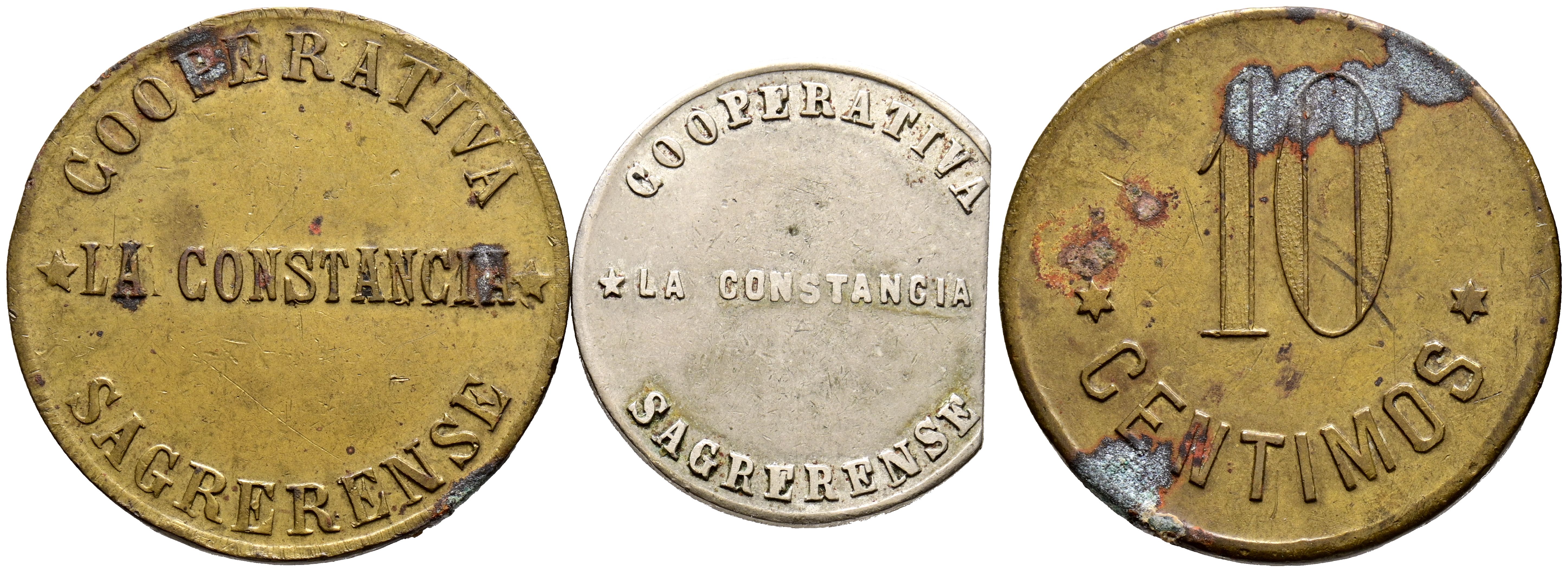 BARCELONA. Tokens. 10 Céntimos y 1 Peseta. Cooperativa Sagrerense. MBC+.