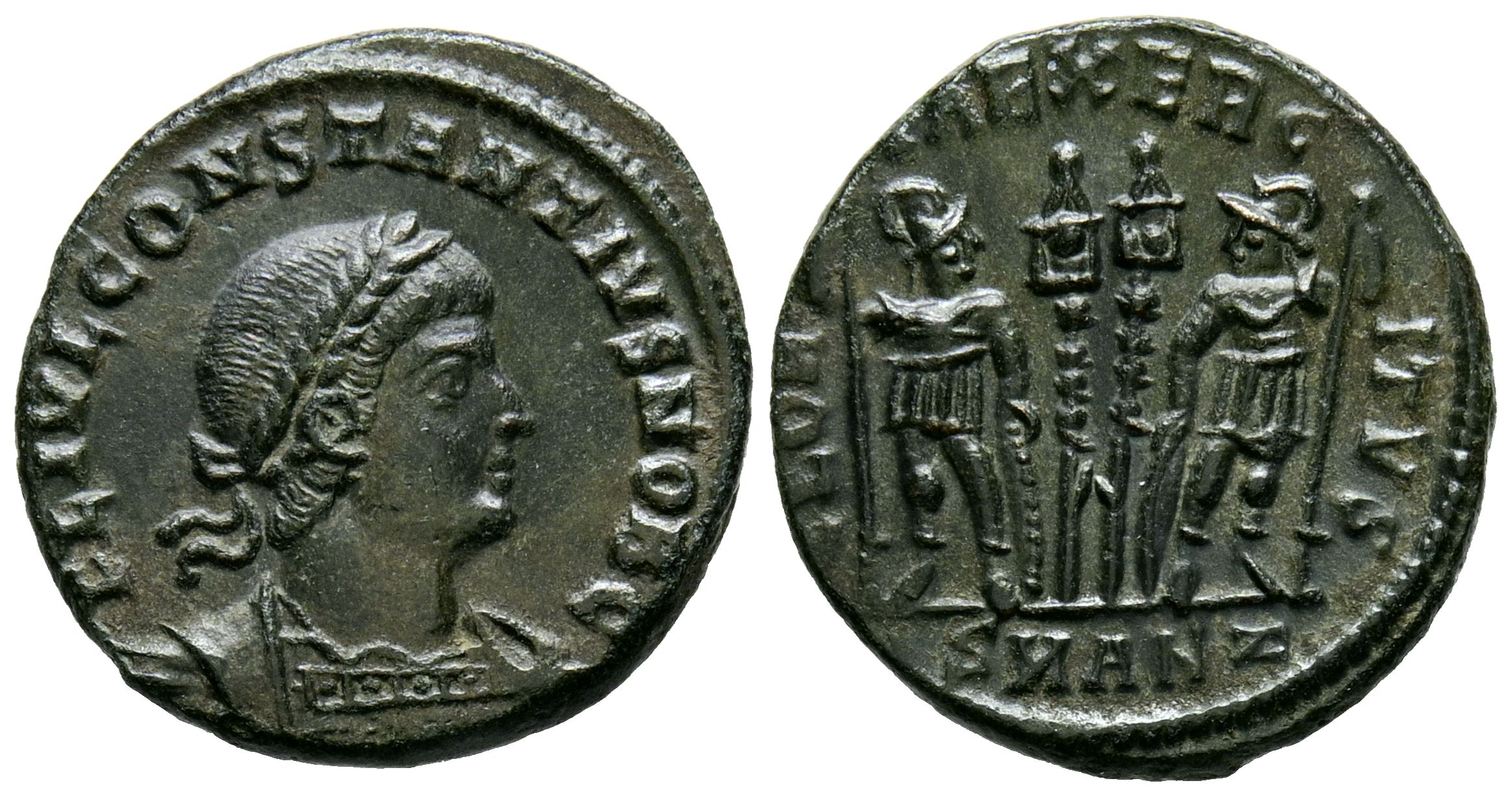 CONSTANCIO II. Follis. (Ae. 2,09g/17mm). 335 d.C. AntioquÃa. (RIC 88). Anv: Busto laureado y con coraza de Constancio II a derecha, alrededor leyenda: FL IVL CONSTANTIVS NOB C. Rev: Dos soldados estantes enfrentados portando lanzas, entre ellos dos estandartes, en exergo: SMANz, alrededor leyenda: GLORIA EXERCITVS. EBC-.