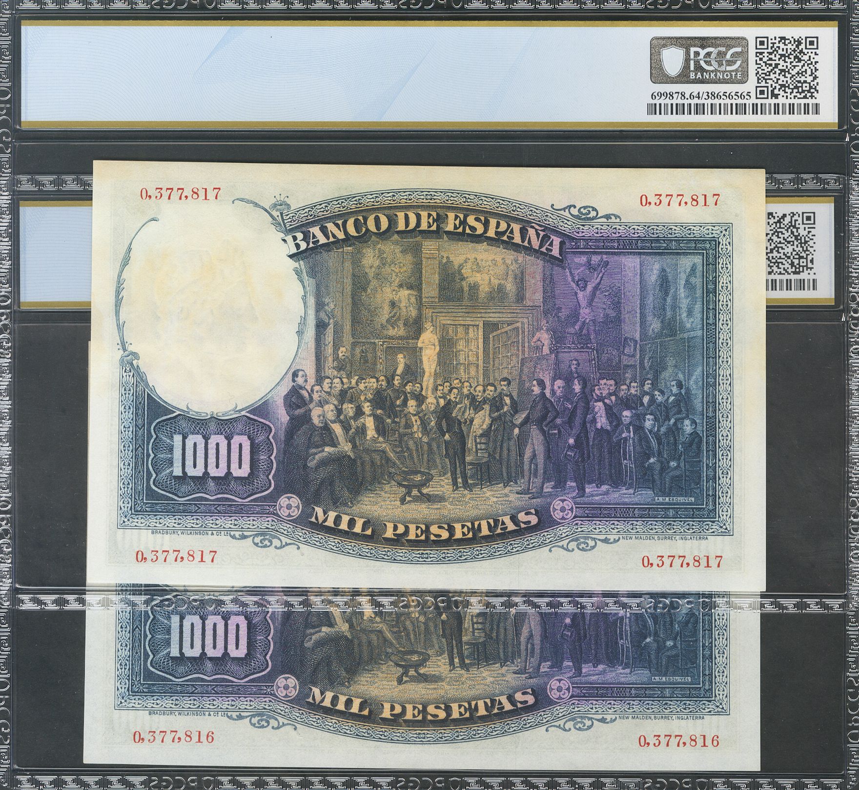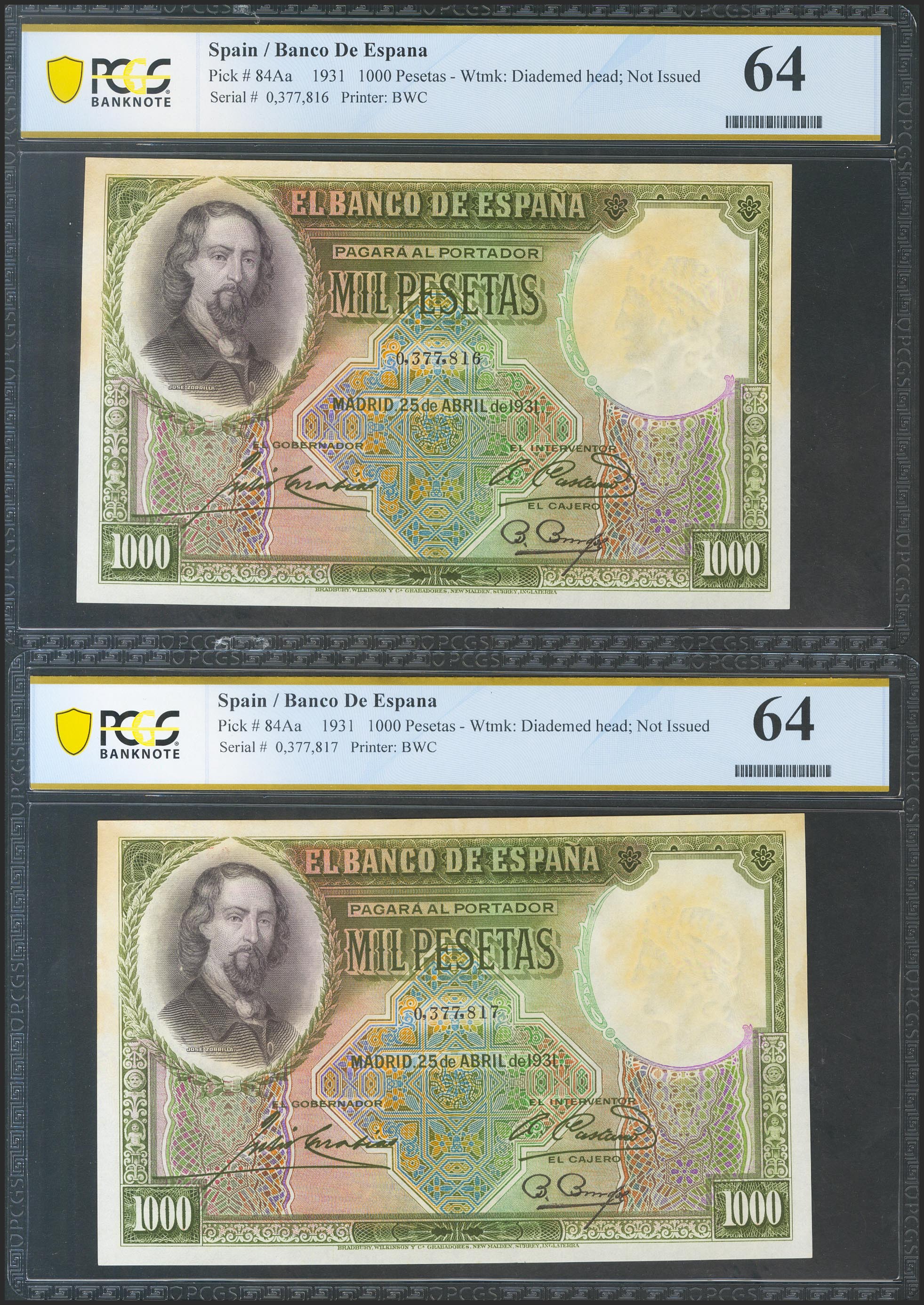 1000 Pesetas. 25 de abril de 1931. Pareja correlativa. Sin serie. (Edifil 2017: 362, Pick: 84Aa). SC. Encapsulado PCGS64, ambos.