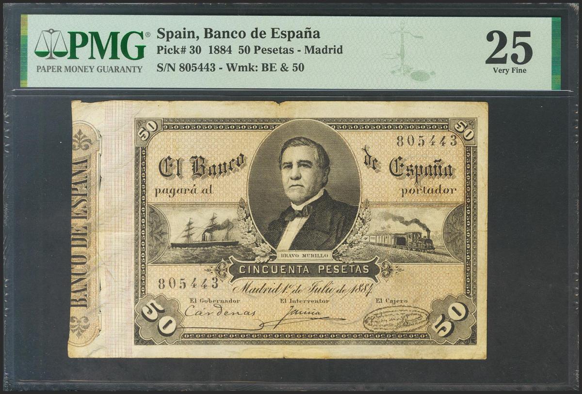 50 Pesetas. 1 de Julio de 1884. Sin serie. (Edifil 2017: 288). Raro billete clásico con los dobleces habituales y sin ninguna restauración. MBC. Encapsulado PMG25.