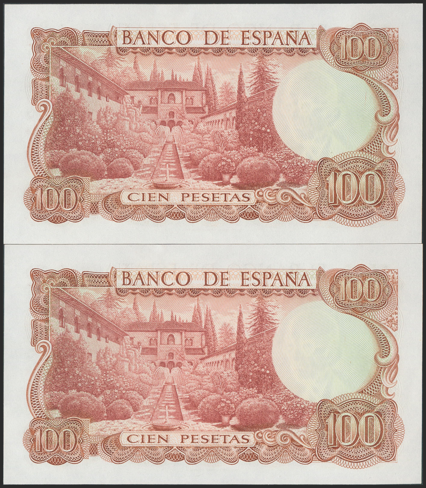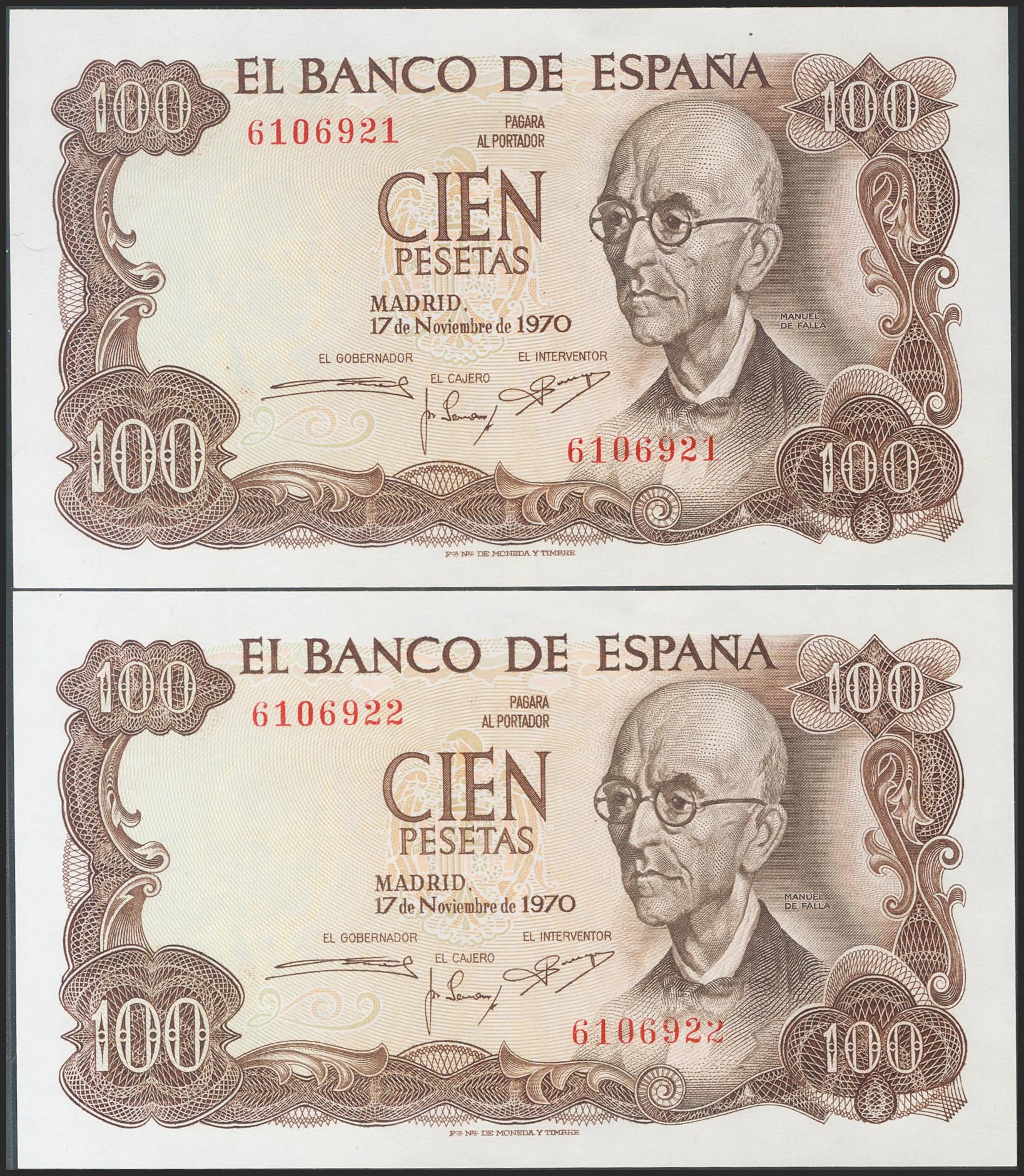 100 Pesetas. 17 de Noviembre de 1970. Pareja correlativa. Sin serie. (Edifil 2017: 472). SC.