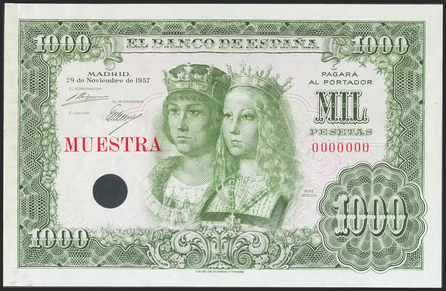 1000 Pesetas. 29 de Noviembre de 1957. SPECIMEN (taladrado) y Nº0000000, sobre cartulina de exposición de la Fábrica Nacional de Moneda y Timbre. (Edifil 2017: 469Ma). Apresto original. SC.
