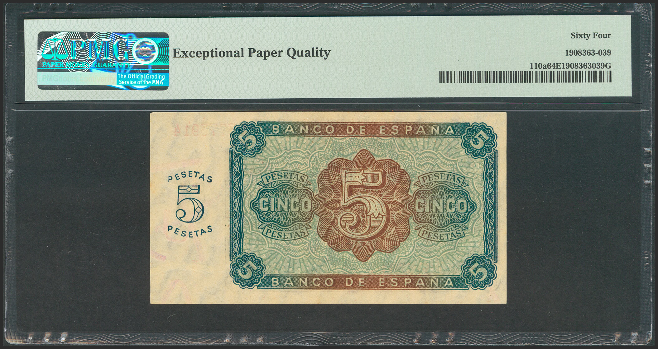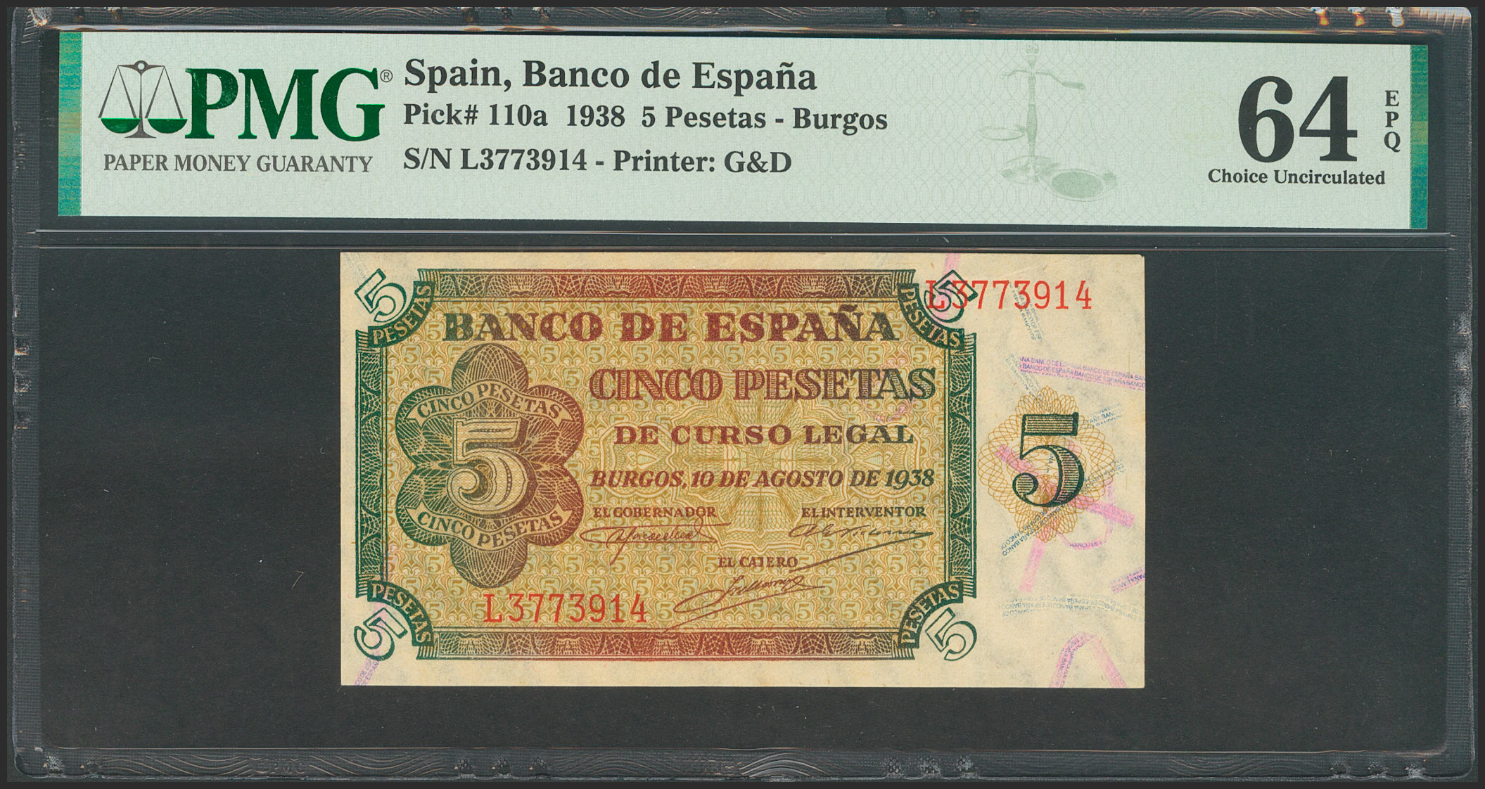 5 Pesetas. 10 de Agosto de 1938. Serie L. (Edifil 2017: 435a). Apresto original. SC. Encapsulado PMG64EPQ.