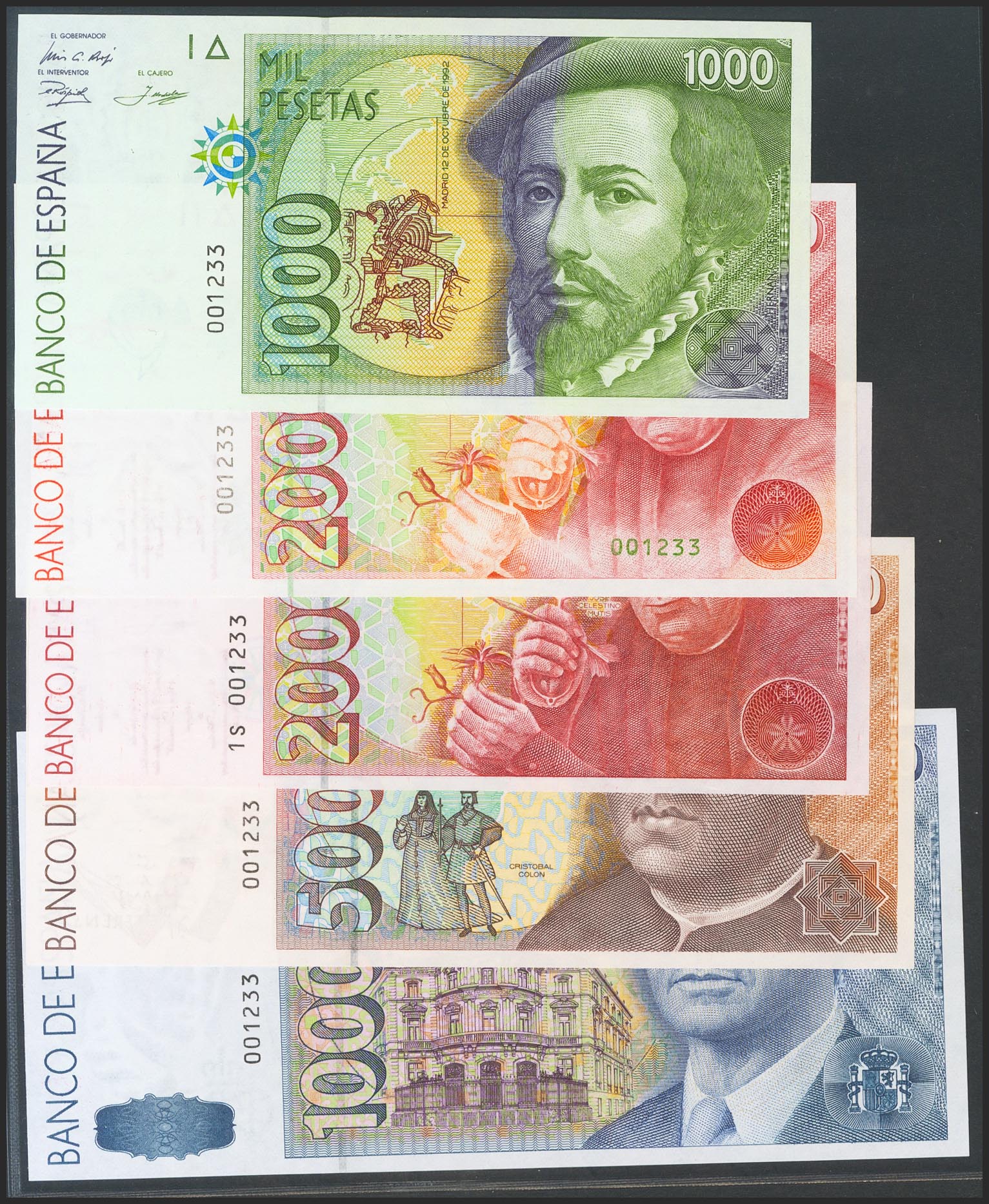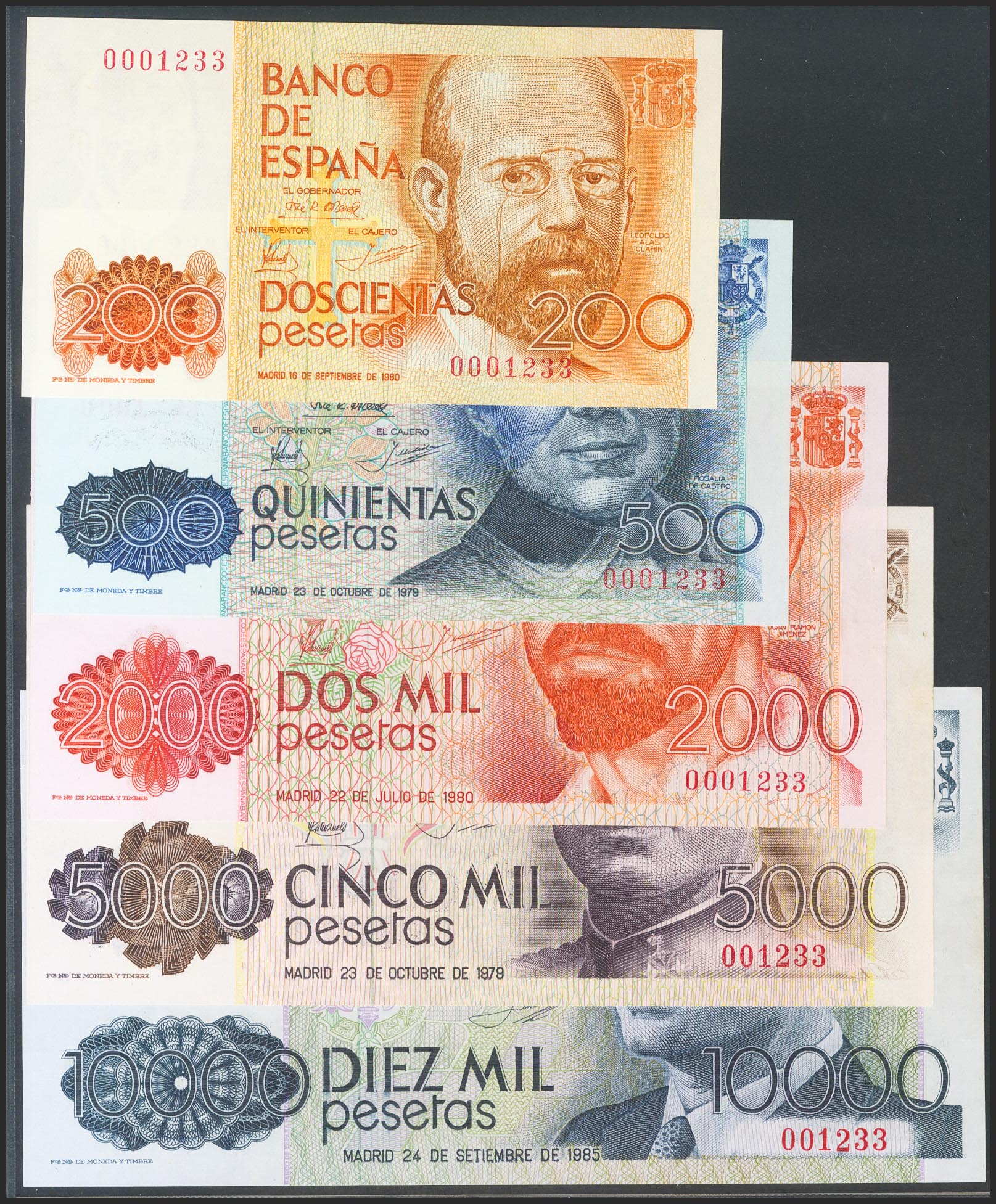 Conjunto de 5 billetes de 200 Pesetas, 500 Pesetas, 2000 Pesetas, 5000 Pesetas y 10000 Pesetas, todos los billetes emitidos entre 1979 y 1985 (a excepción del 1000 Pesetas), todos sin serie y con la misma baja numeración 001233, además la serie completa de 5 billetes de la emisión de 1992 (incluyendo el de 2000 Pesetas de 1995 con la serie 1S), todos sin serie y con la misma numeración baja que el grupo anterior 001233. (Edifil 2017: 476, 478/81, 482/85, 482A). RarÃsimo conjunto. SC.