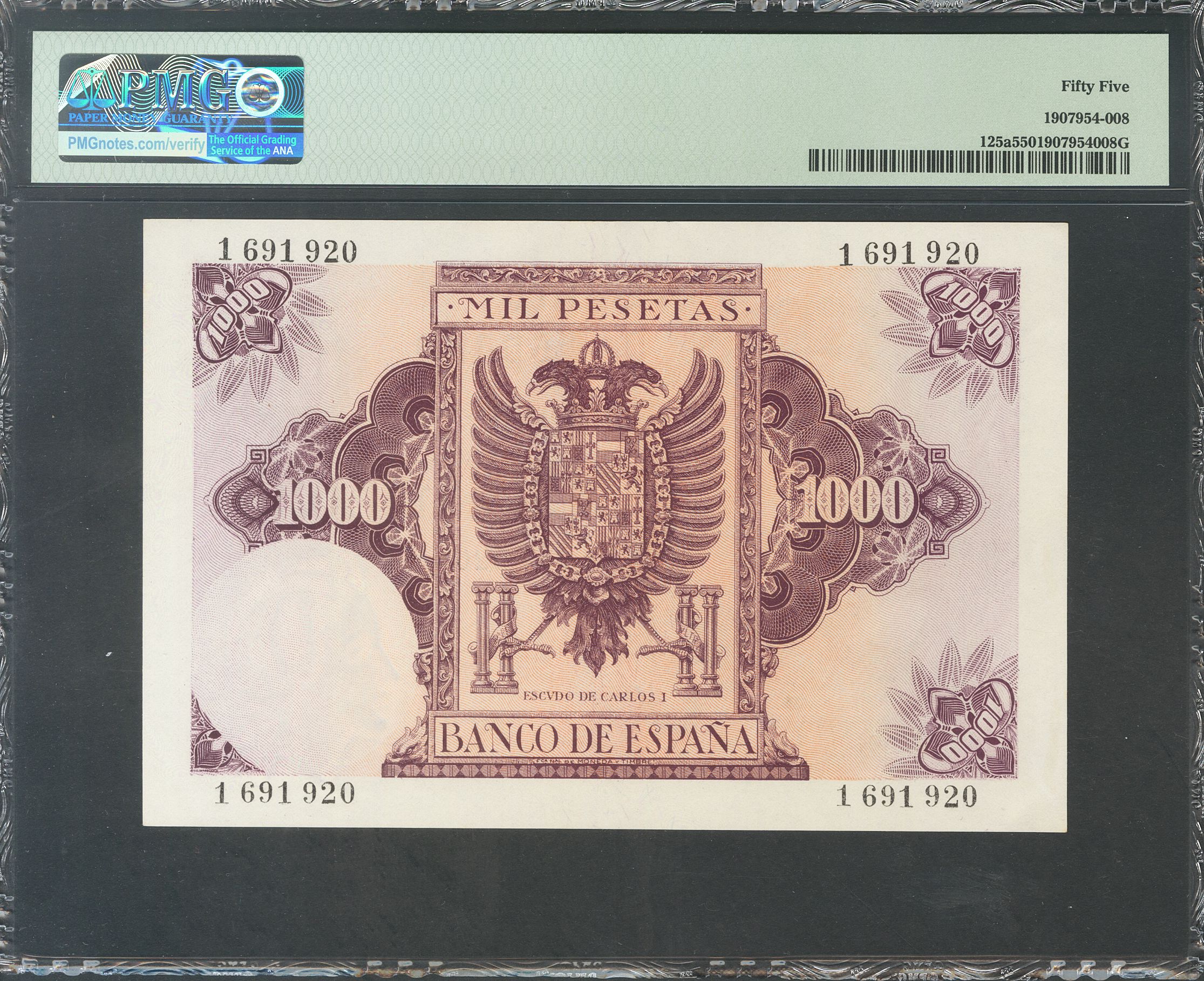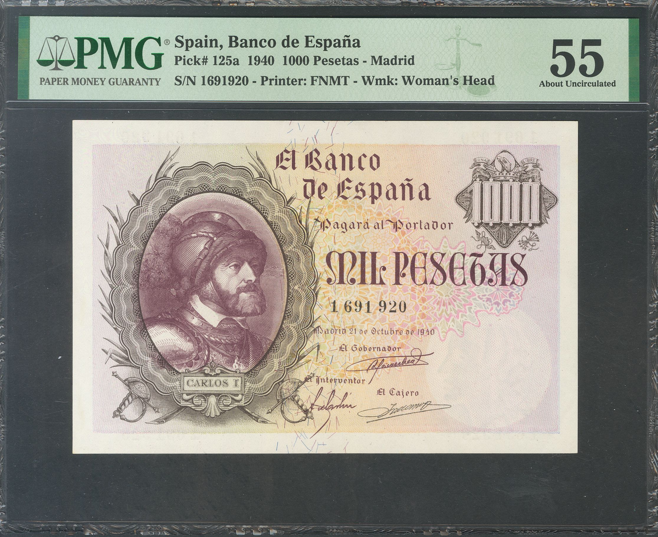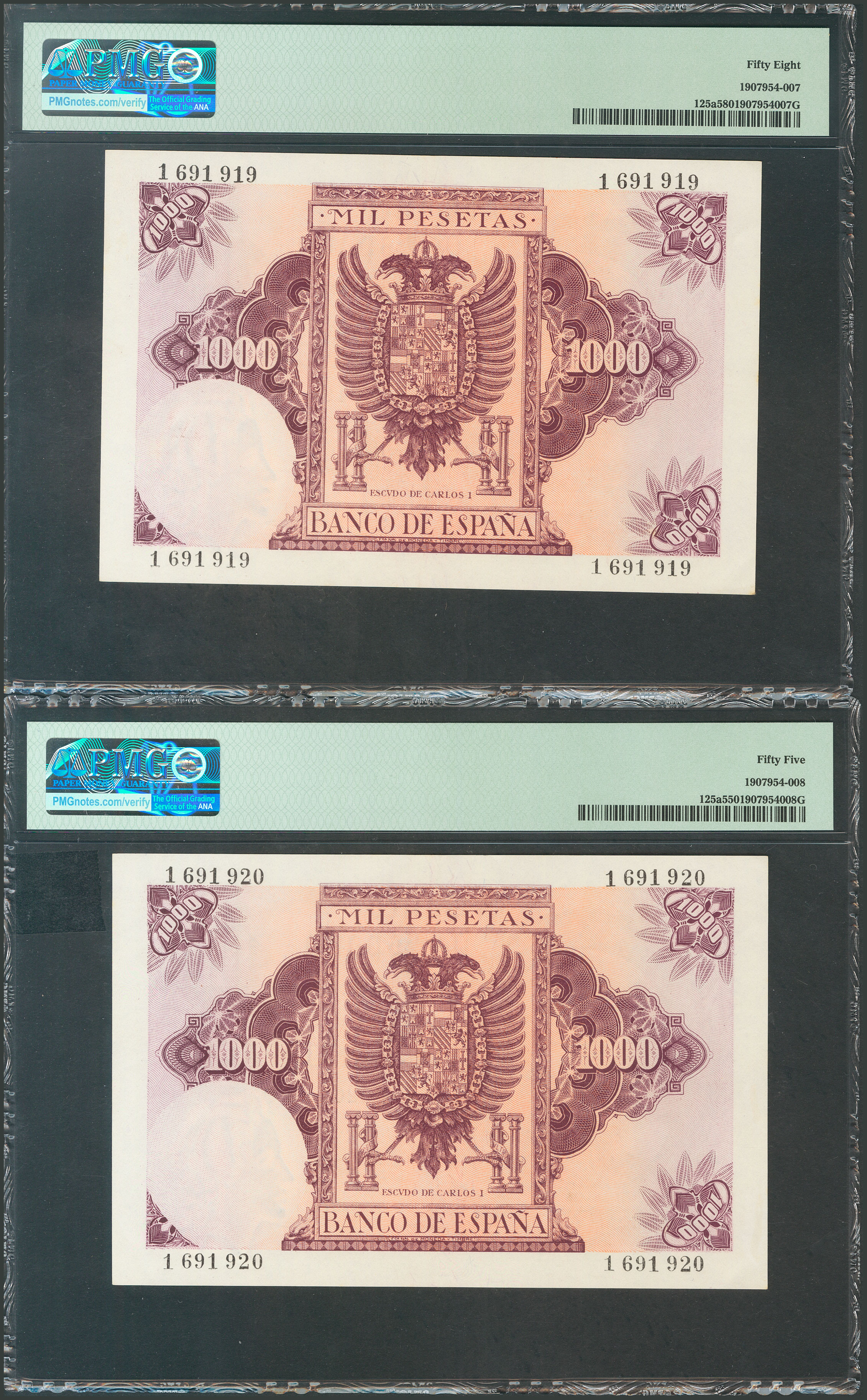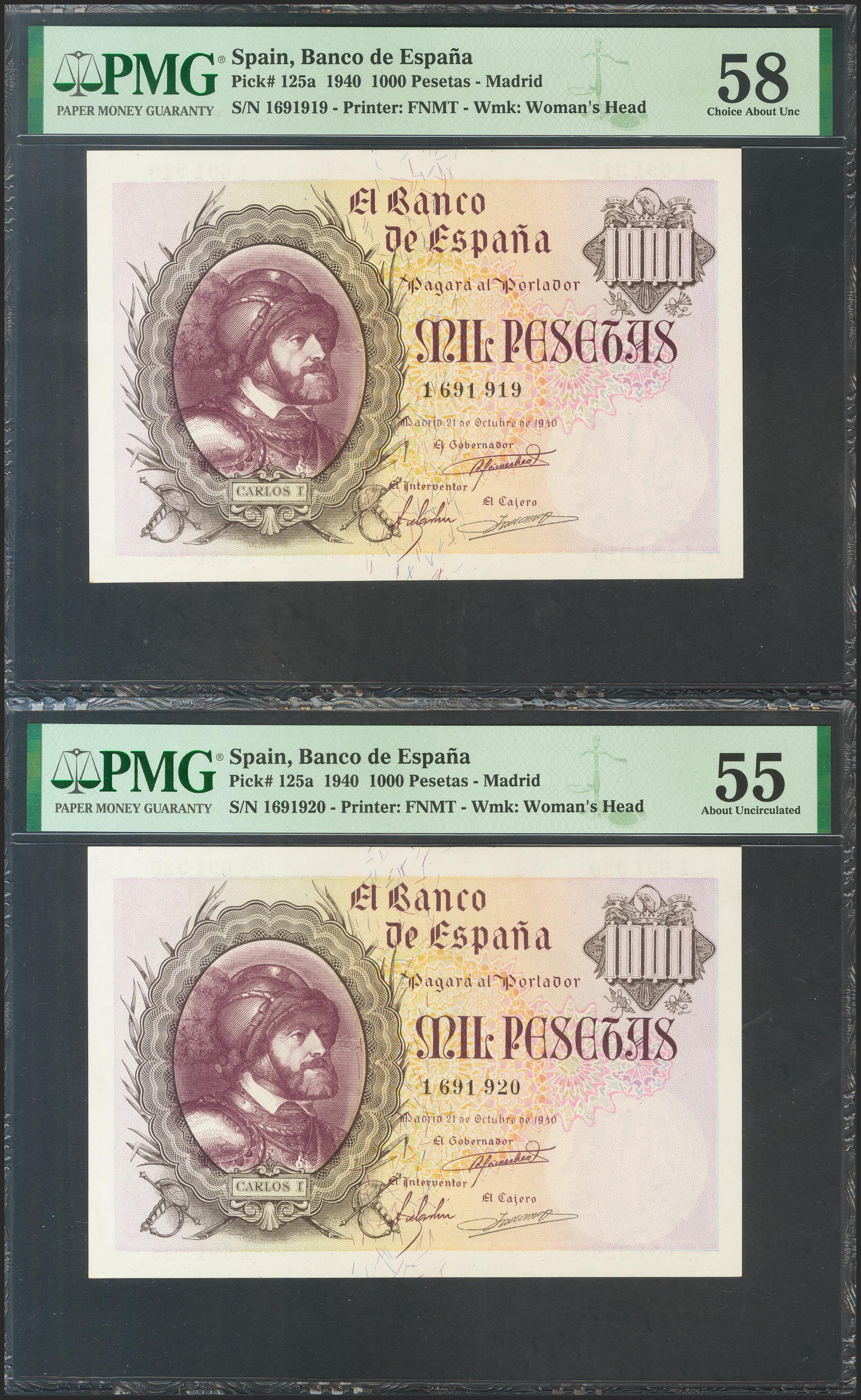 1000 Pesetas. 21 de Octubre de 1940. Pareja correlativa. Sin serie. (Edifil 2017: 445). RarÃsima pareja, la mejor conservada de todas las conocidas. EBC+. Encapsulados PMG58/55, respectivamente.