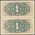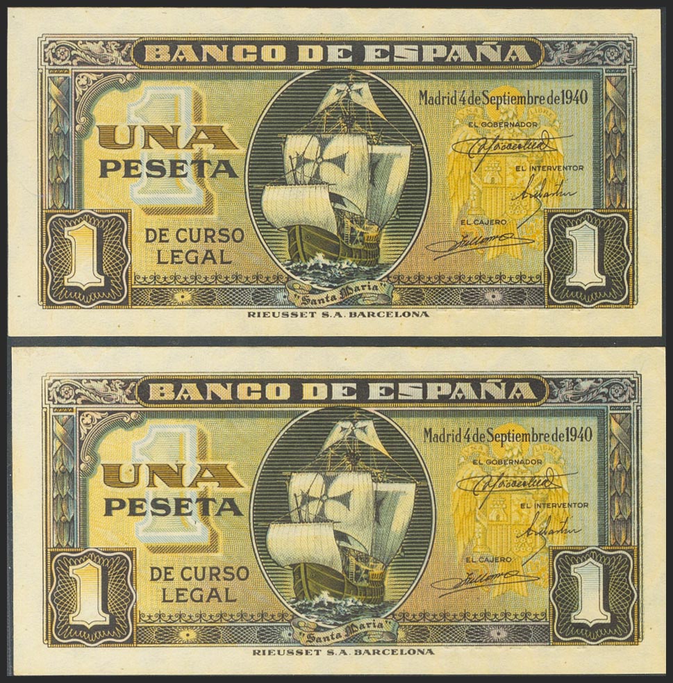 1 Peseta. 4 de Septiembre de 1940. Pareja correlativa. Serie I, última serie emitida. (Edifil 2017: 442a). Conserva todo su apresto original. SC-.
