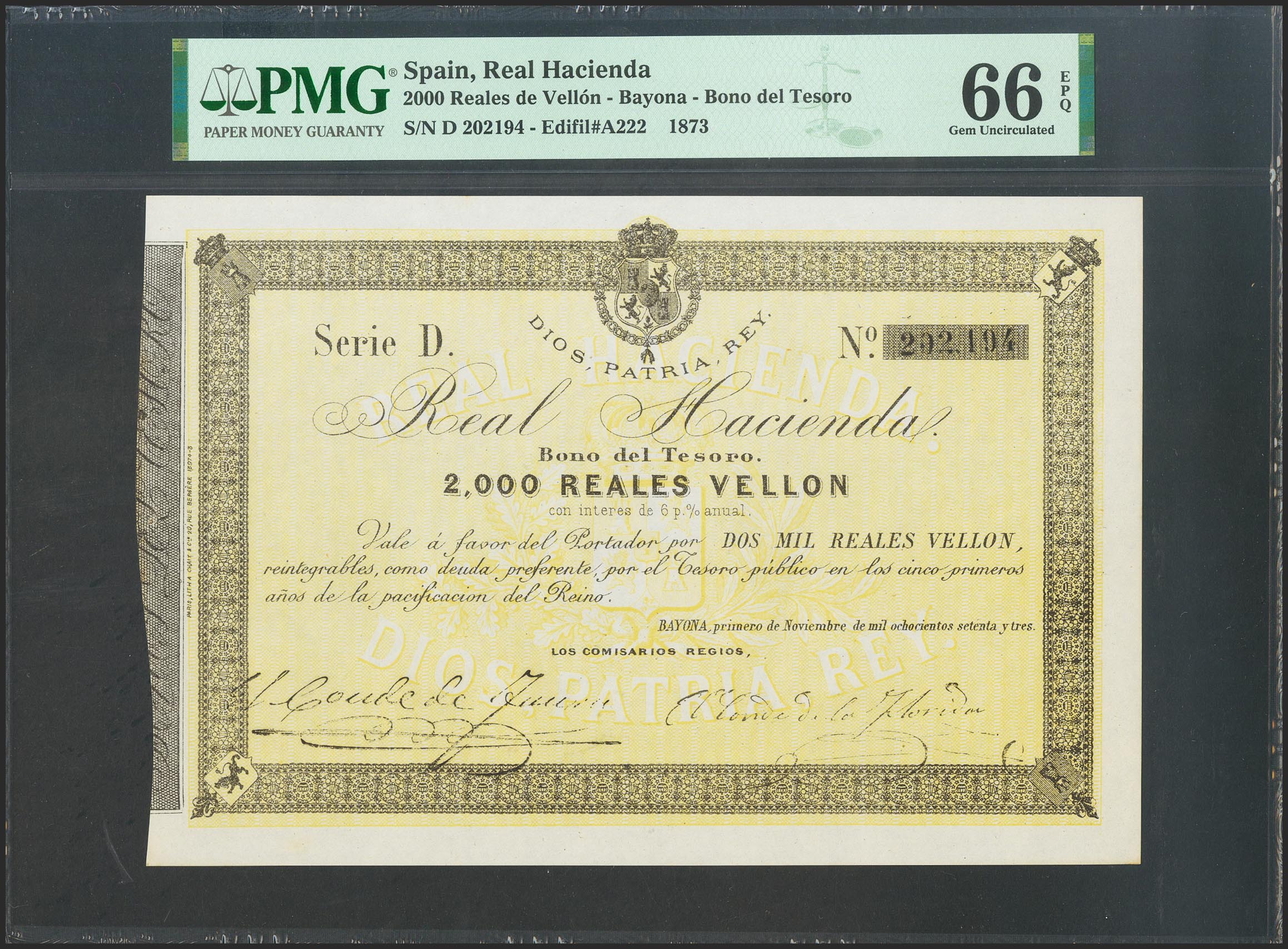 2000 Reales de Vellón. Emisión Carlista emitida en Bayona. 1 Noviembre 1873. Serie D. (Edifil 2017: 213). SC. Encapsulado PMG66EPQ.