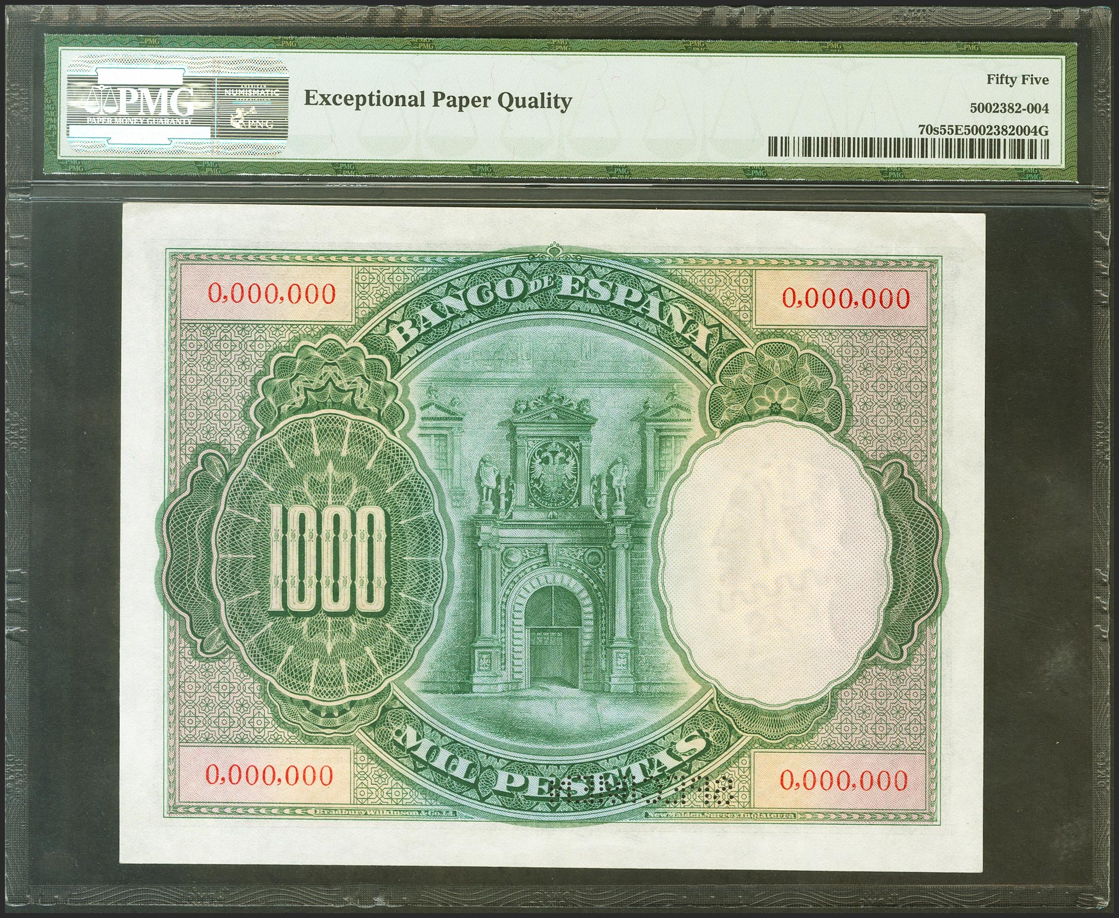 100 Pesetas. 1 de Julio de 1925. Sin serie, numeración 0.000.000 y taladrado SPECIMEN. (Edifil 2021: 324P). Raro, procedente del archivo Bradbury. EBC+. Encapsulado PMG55EPQ.