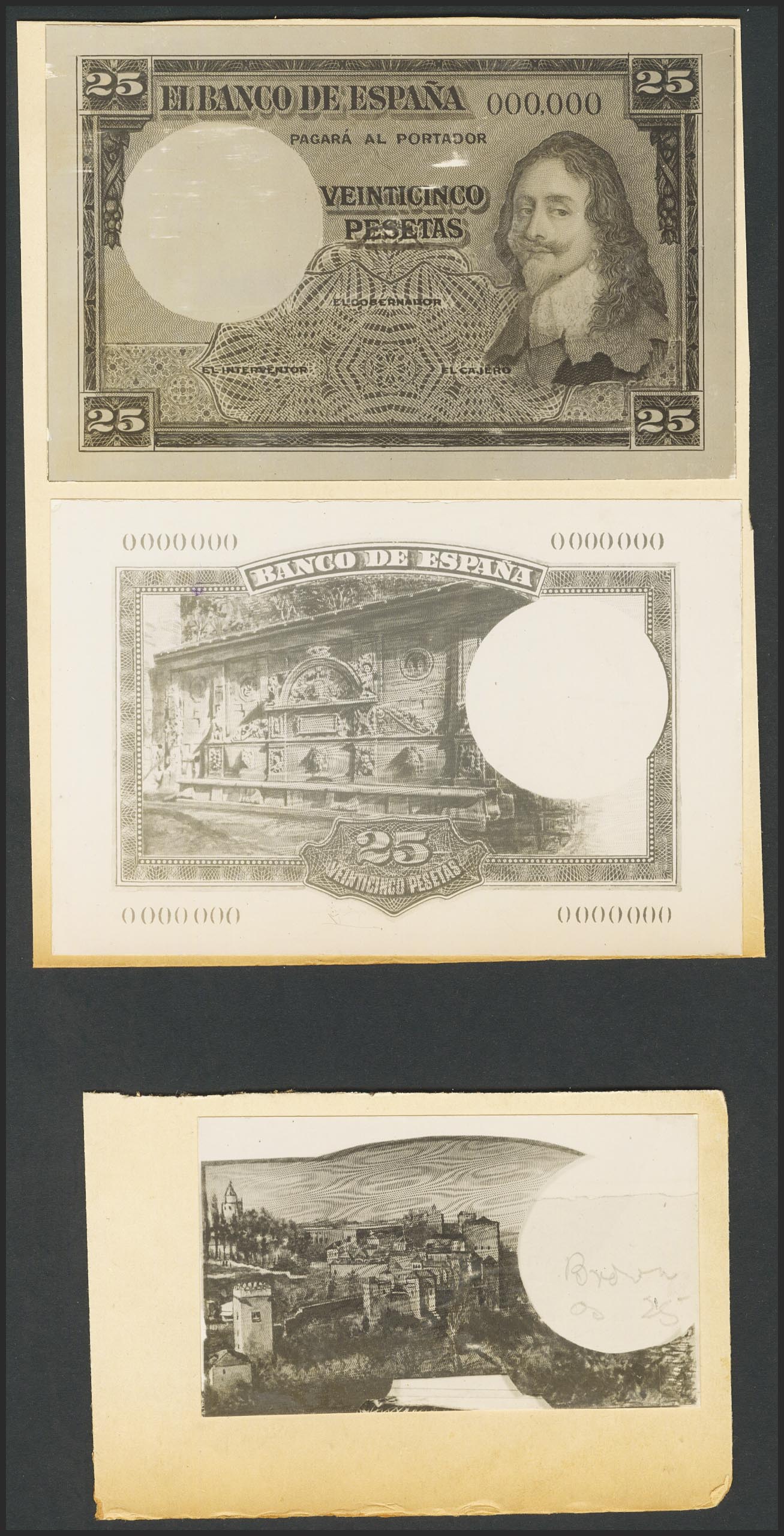 (1931ca). Conjunto de 3 pruebas fotográficas de un billete no emitido de 25 Pesetas, presentando el busto de Carlos I de Inglaterra (incluye la prueba de anverso y reverso con la numeración 000000 y otra prueba del reverso con otro motivo). Precioso y rarÃsimo conjunto de un billete inédito hasta la fecha.