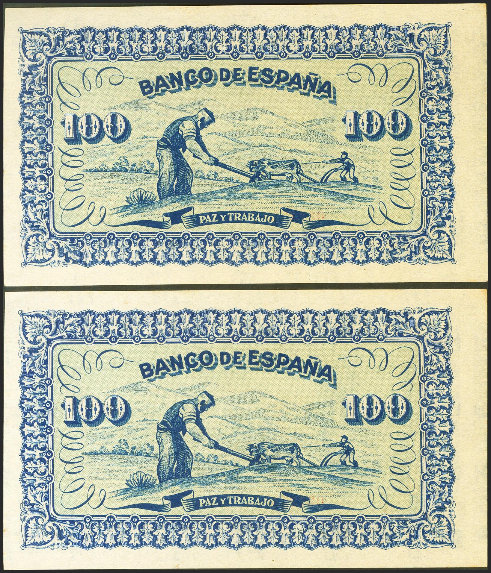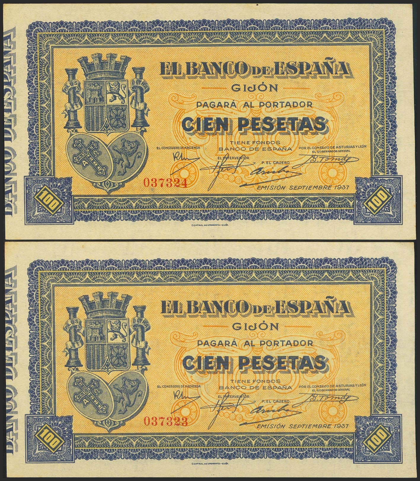 100 Pesetas. Septiembre 1937. Pareja correlativa. Sucursal de Gijón. Sin serie. (Edifil 2021: 399). Apresto original. SC-.
