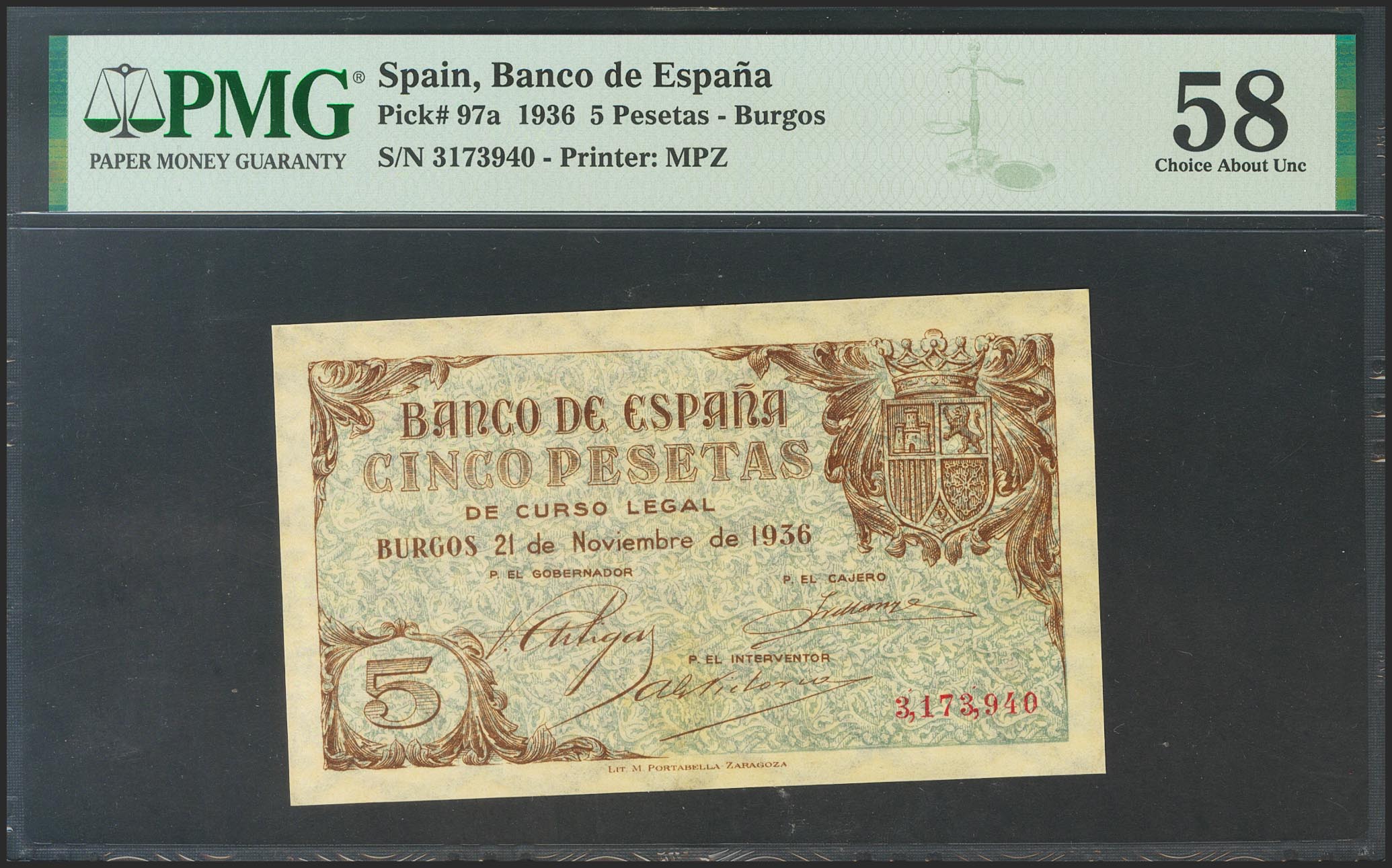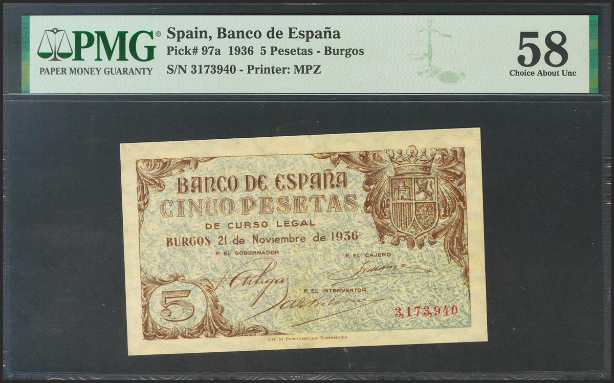 5 Pesetas. 21 de Noviembre de 1936. Sin serie. (Edifil 2017: 417). Inusual en esta calidad. EBC+. Encapsulado PMG58.