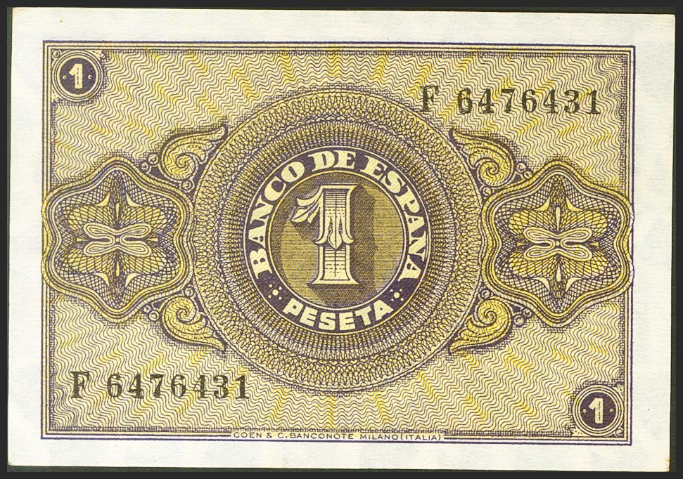 1 Peseta. 12 de Octubre de 1937. Serie F, última serie emitida. (Edifil 2021: 425a). Apresto original. SC.