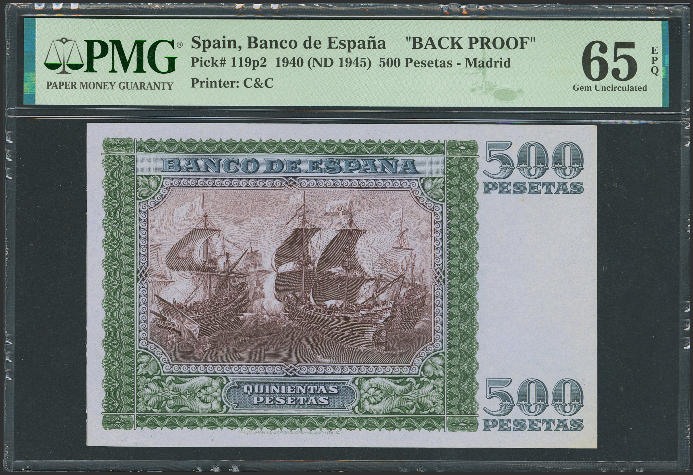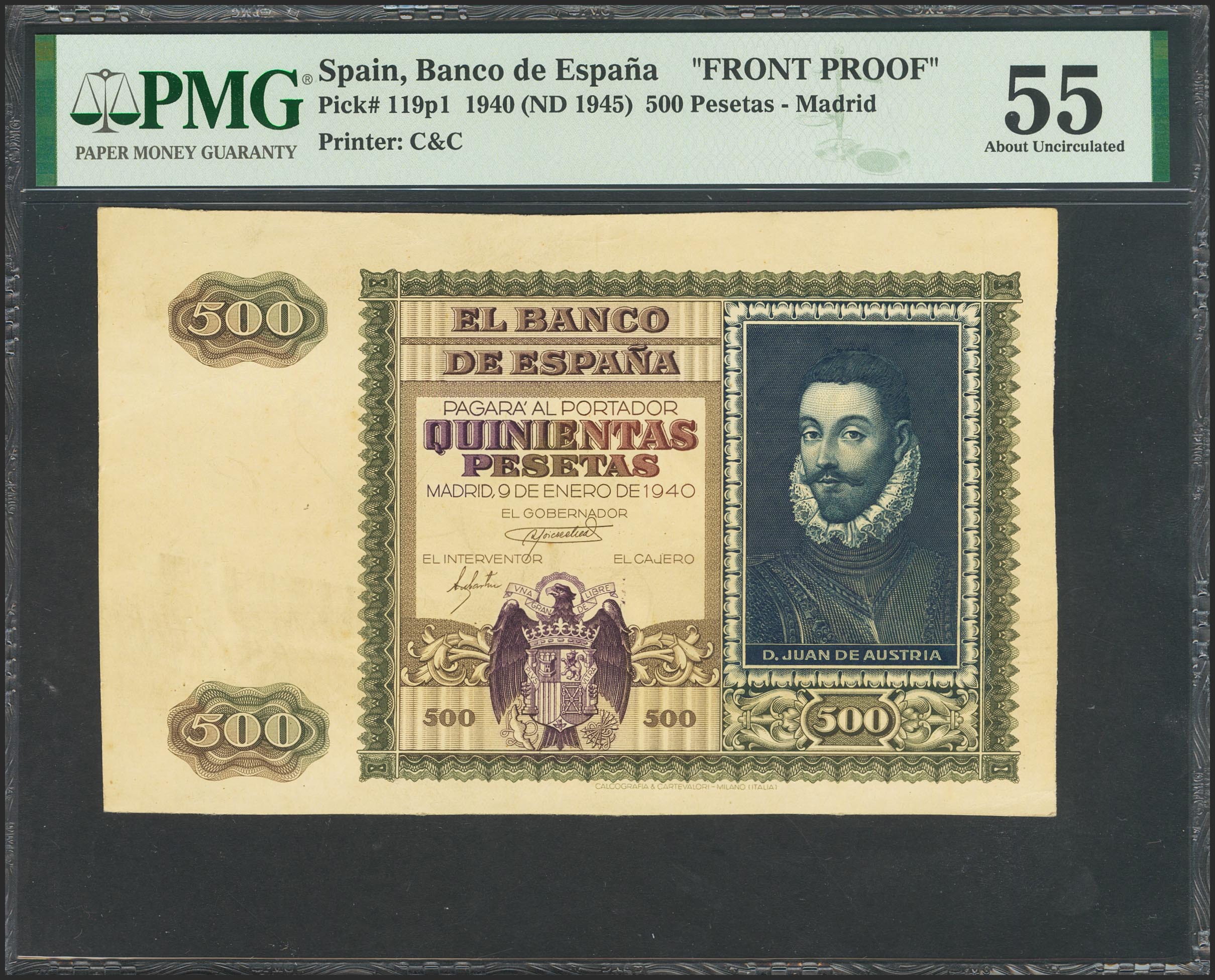500 Pesetas. 9 de Enero de 1940. Prueba de anverso y reverso, sin numeración y sin firma del cajero. (Edifil 2017: 439Pa). Muy bonita y muy rara. EBC+. Encapsulado PMG55/65EPQ.