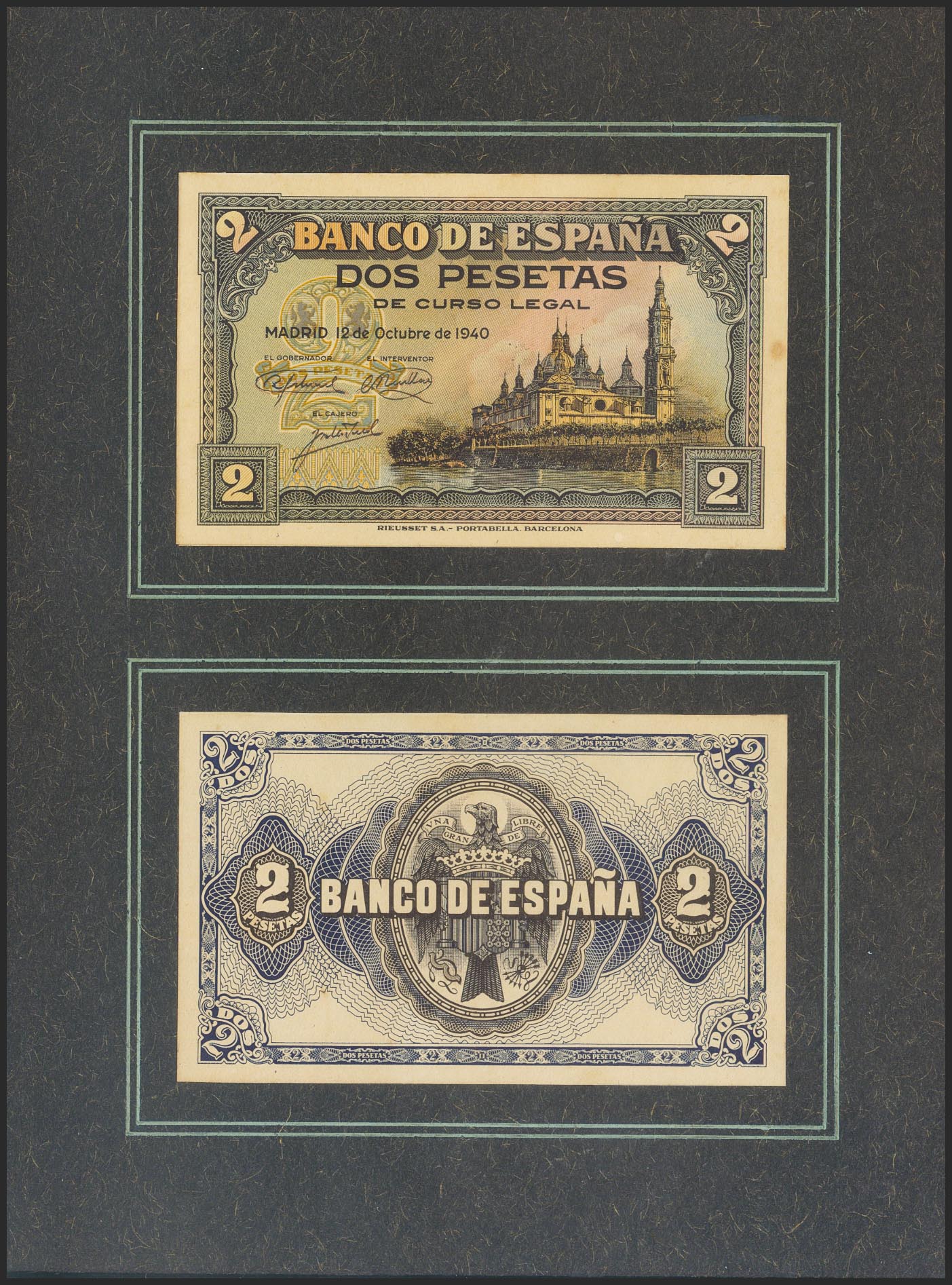 2 Pesetas. Prueba de anverso y reverso de un billete no emitido y fechado el 19 de Octubre de 1940, sin serie y sin numeración. (Edifil 2017: NE51P, NE51Pa). Extraordinariamente rara y espectacular, tenemos constancia de la existencia de otros dos juegos completos. SC.