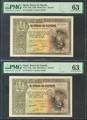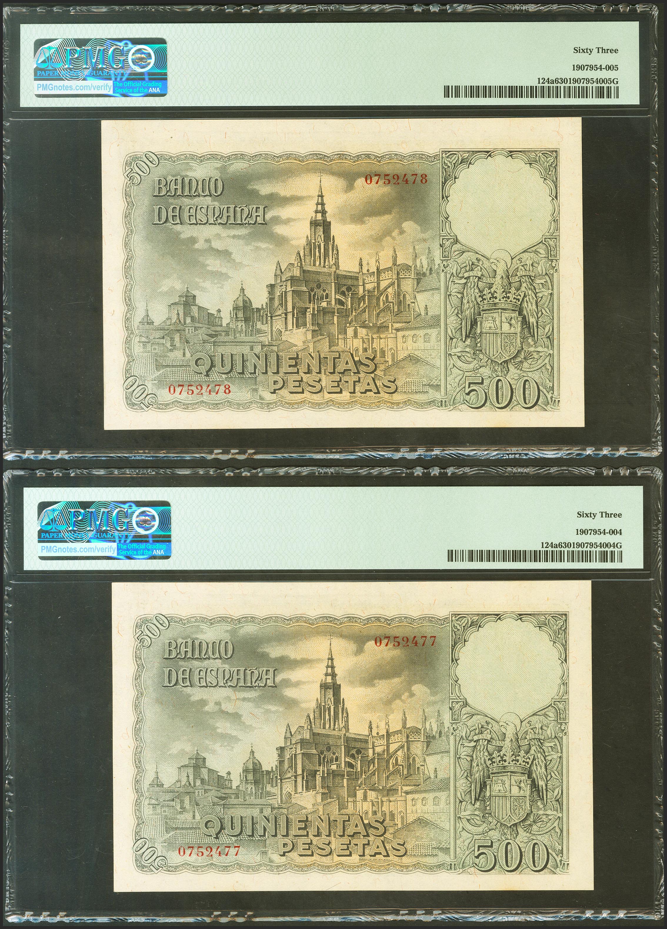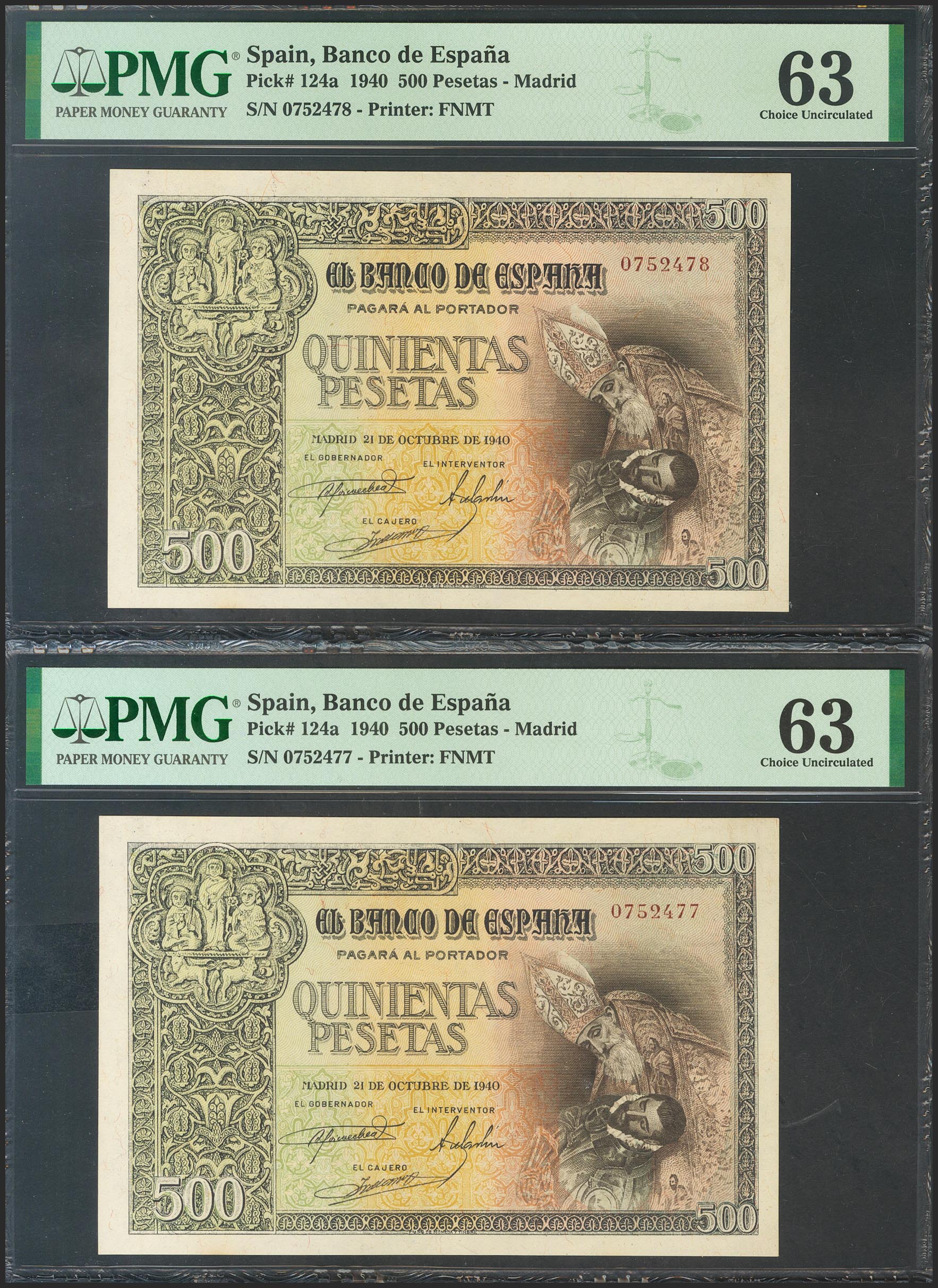500 Pesetas. 21 de Octubre de 1940. Pareja correlativa. Sin serie. (Edifil 2017: 444). RarÃsima, especialmente en esta calidad. SC. Encapsulado PMG63, ambos.