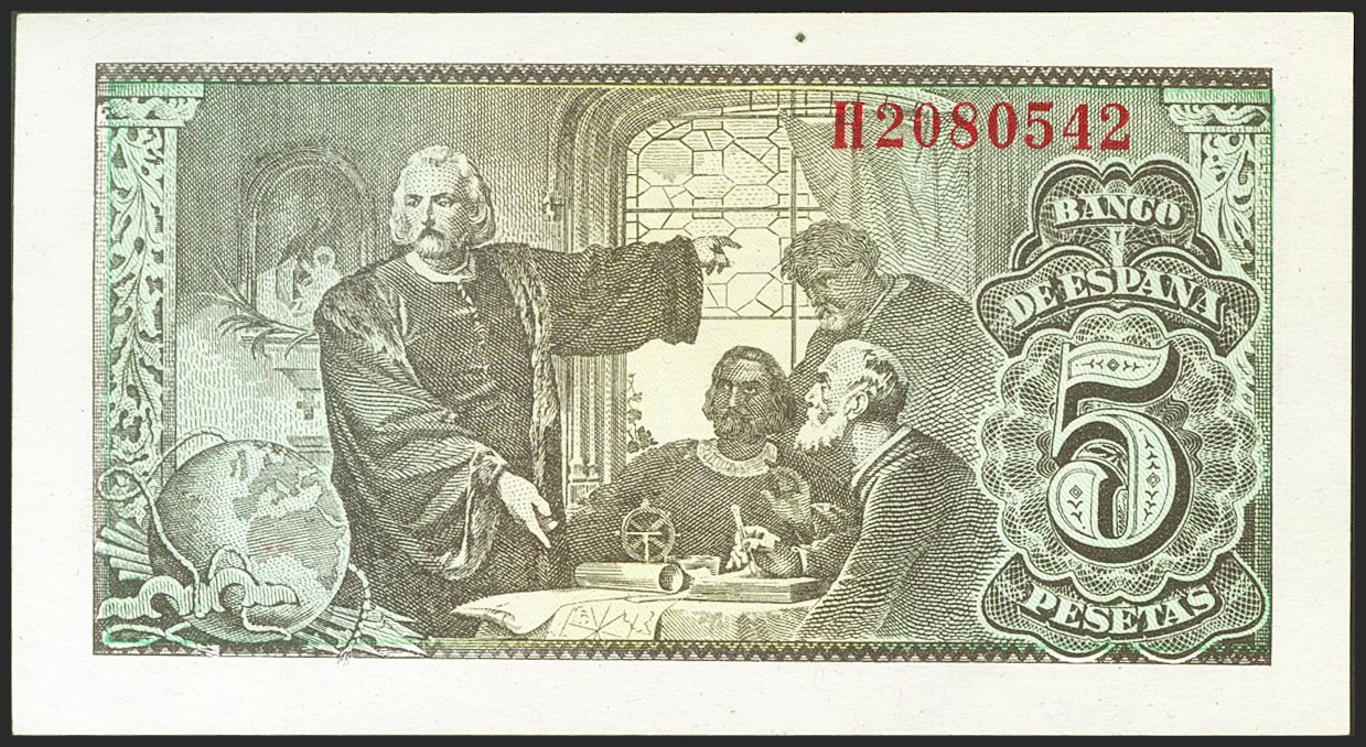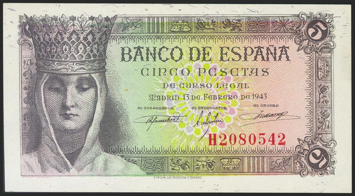 5 Pesetas. 13 de Febrero de 1943. Serie H. (Edifil 2017: 446a). Apresto original. SC.