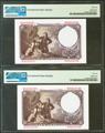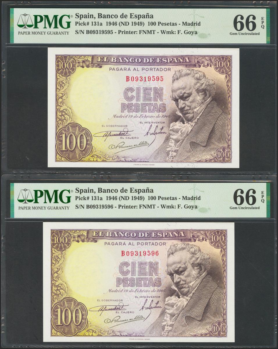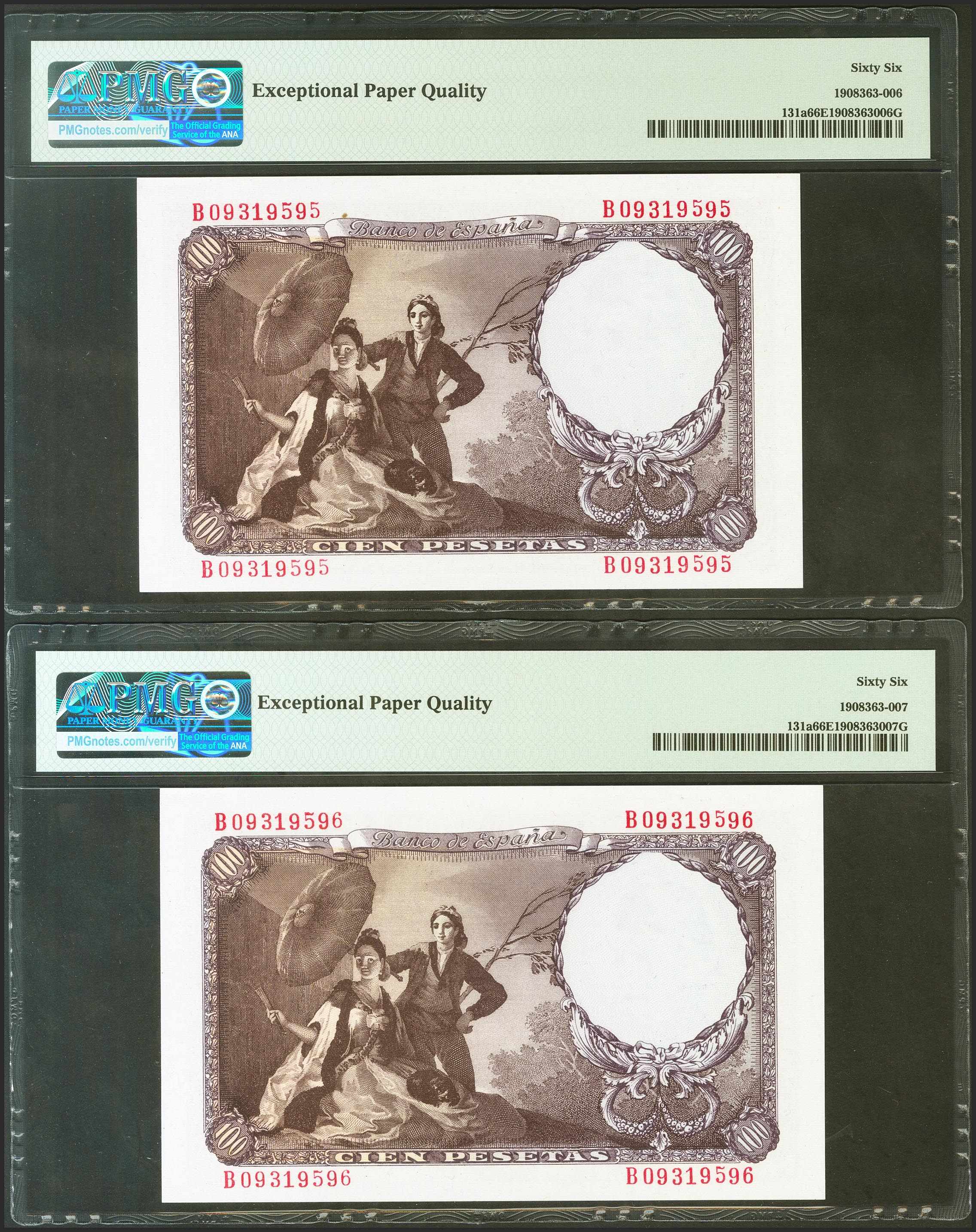 100 Pesetas. 19 de Febrero de 1946. Pareja correlativa. Serie B. (Edifil 2017: 451b). Conserva todo su apresto original. SC. Encapsulados PMG66EPQ, ambos.