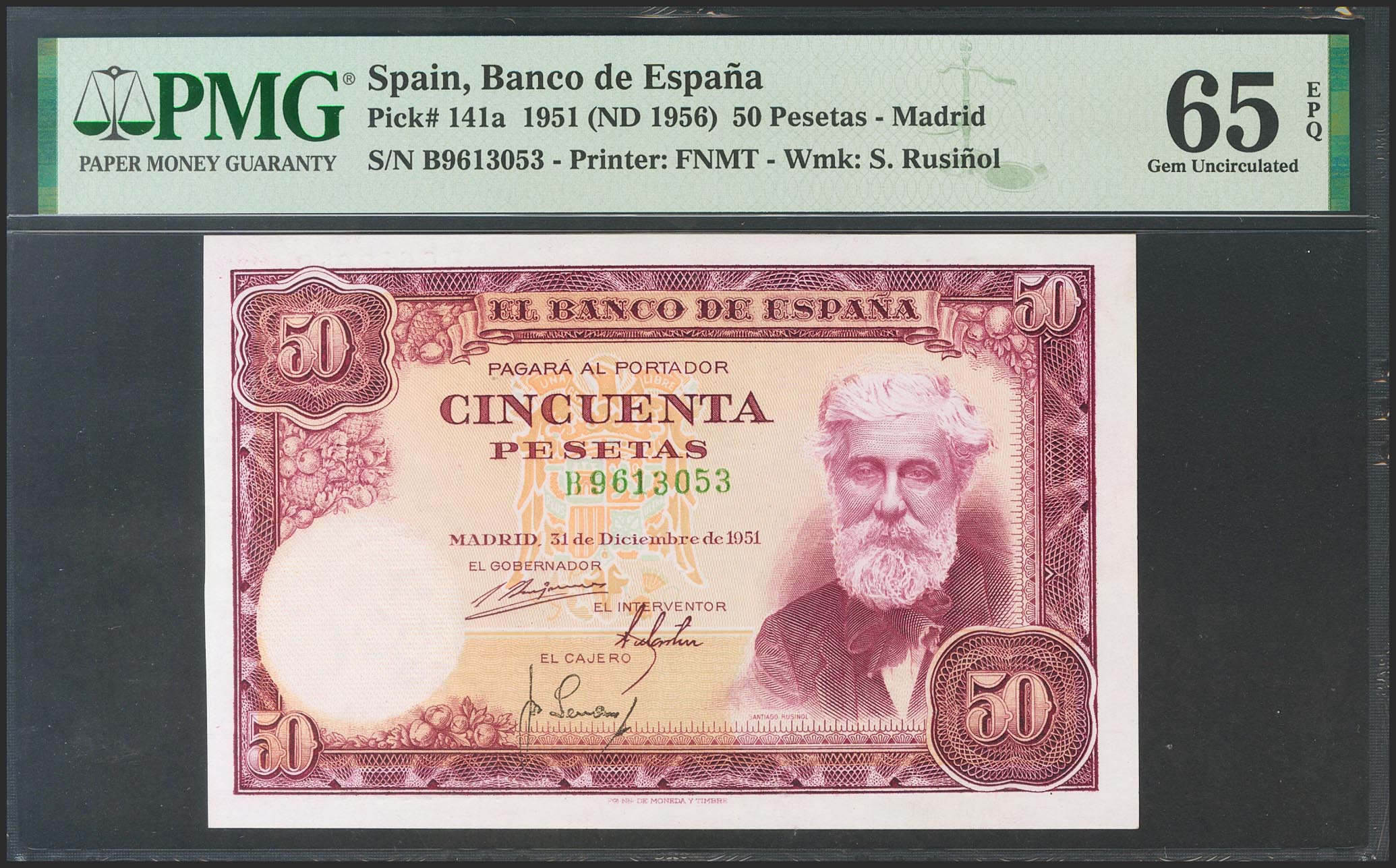 50 Pesetas. 31 de Diciembre de 1951. Serie B. (Edifil 2017: 462a). Inusual asÃ, conserva todo su apresto original. SC. Encapsulado PMG65EPQ.