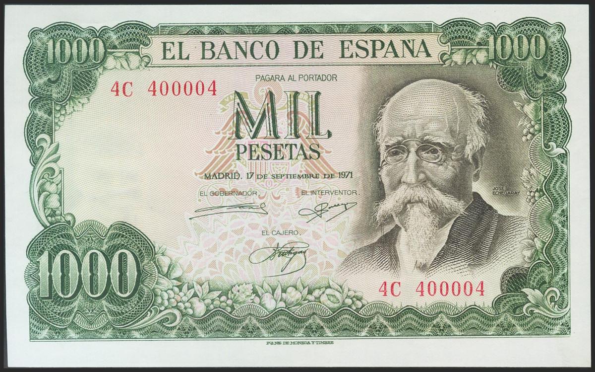 1000 Pesetas. 17 de Septiembre de 1971. Serie 4C y capicúa. (Edifil 2021: 474c). Muy raro, apresto original. SC.