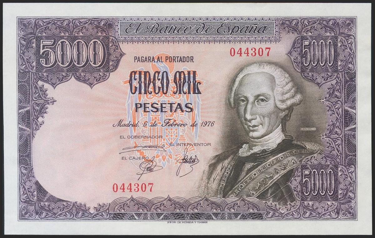 5000 Pesetas. 6 de Febrero de 1976. Sin serie y numeración baja. (Edifil 2017: 475). Apresto original. SC.