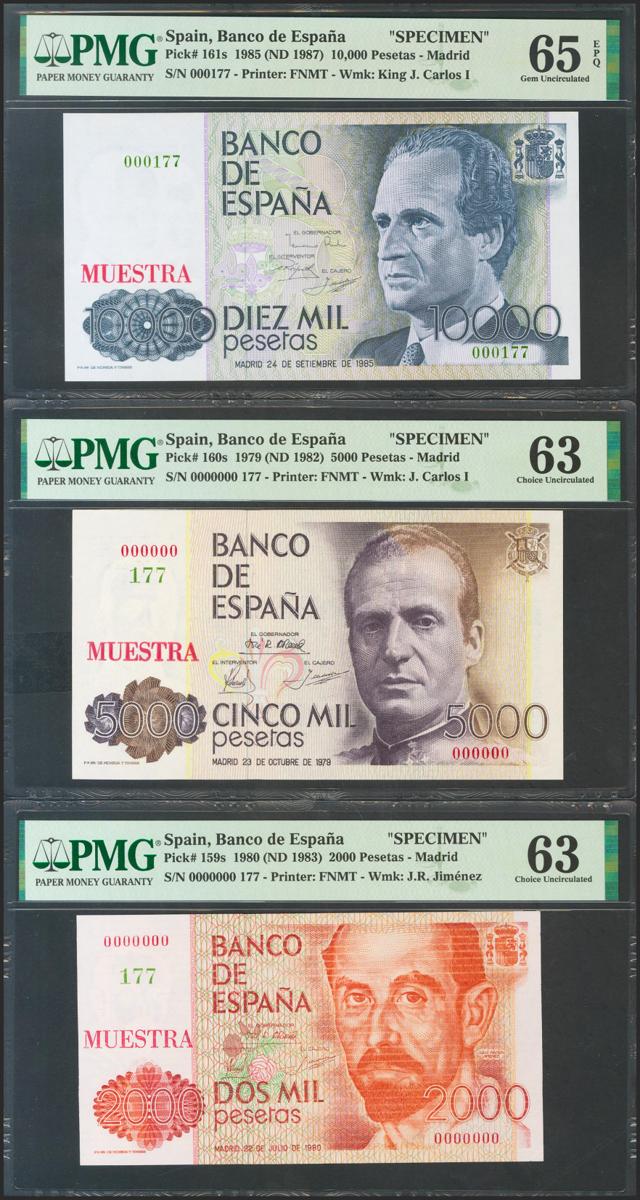 Conjunto de los 6 billetes de 200 Pesetas, 500 Pesetas, 1000 Pesetas, 2000 Pesetas, 5000 Pesetas y 10000 Pesetas emitidos entre el 23 de Octubre de 1979 y el 24 de Septiembre de 1985, todos ellos con la misma numeración MUESTRA Nº177 y Nº0000000. (Edifil 2021: 476/81M). Conjunto extraordinariamente raro, posiblemente único conocido. SC. Encapsulados PMG63, todos excepto el de 10000 Pesetas que es PMG65EPQ.
