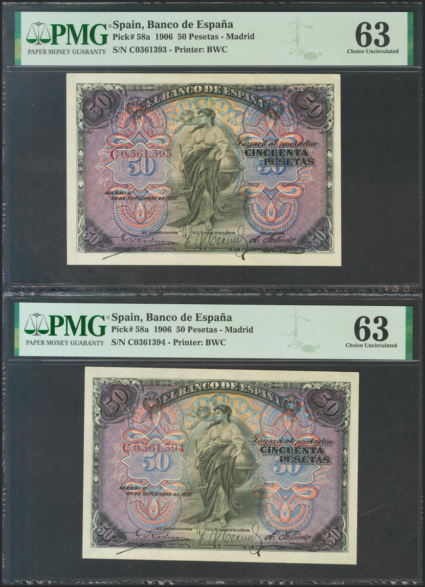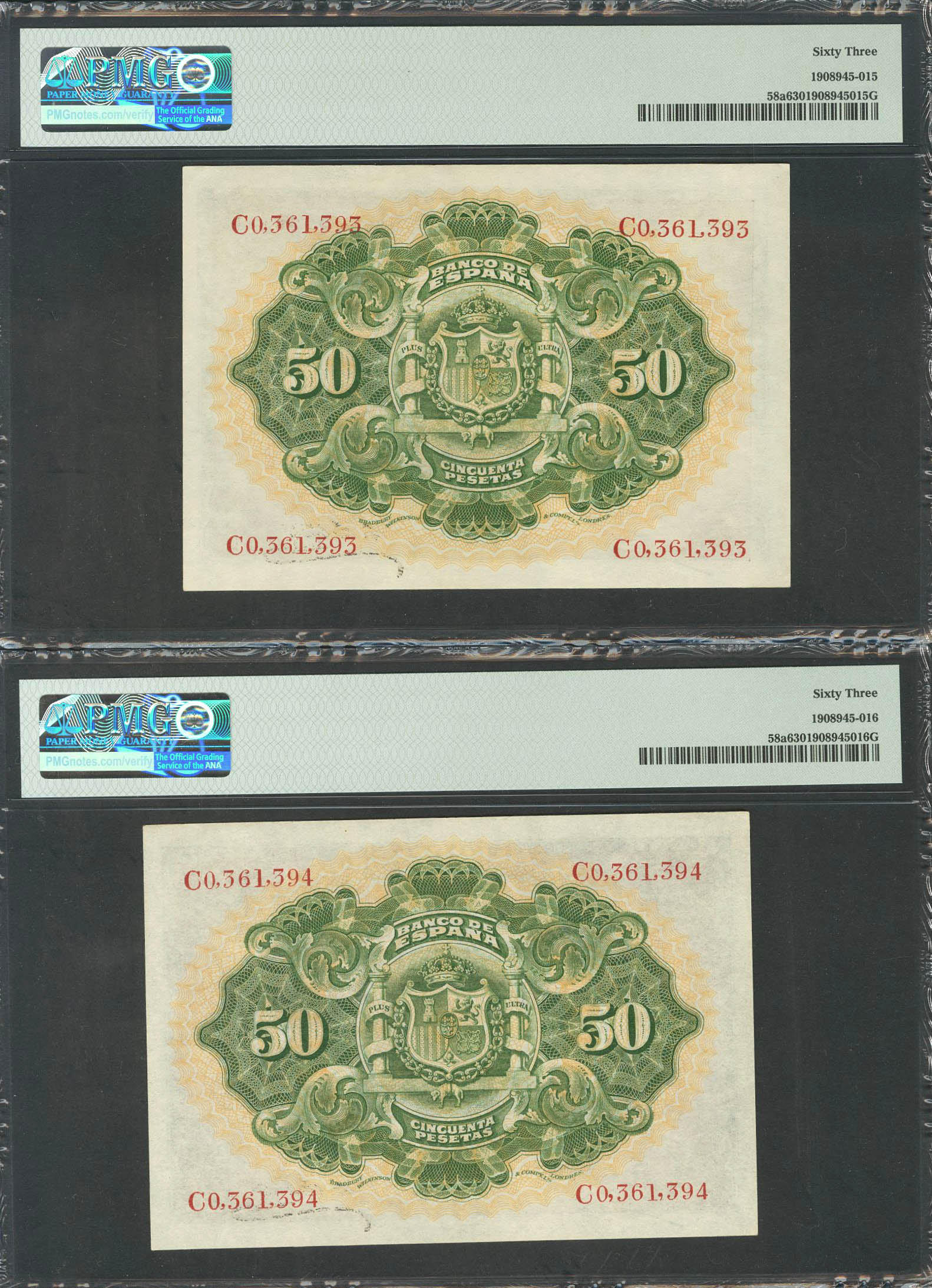 50 Pesetas. 24 de Septiembre de 1906. Pareja correlativa. Serie C. (Edifil 2017: 315a). Rara. SC. Encapsulados PMG63, ambos.
