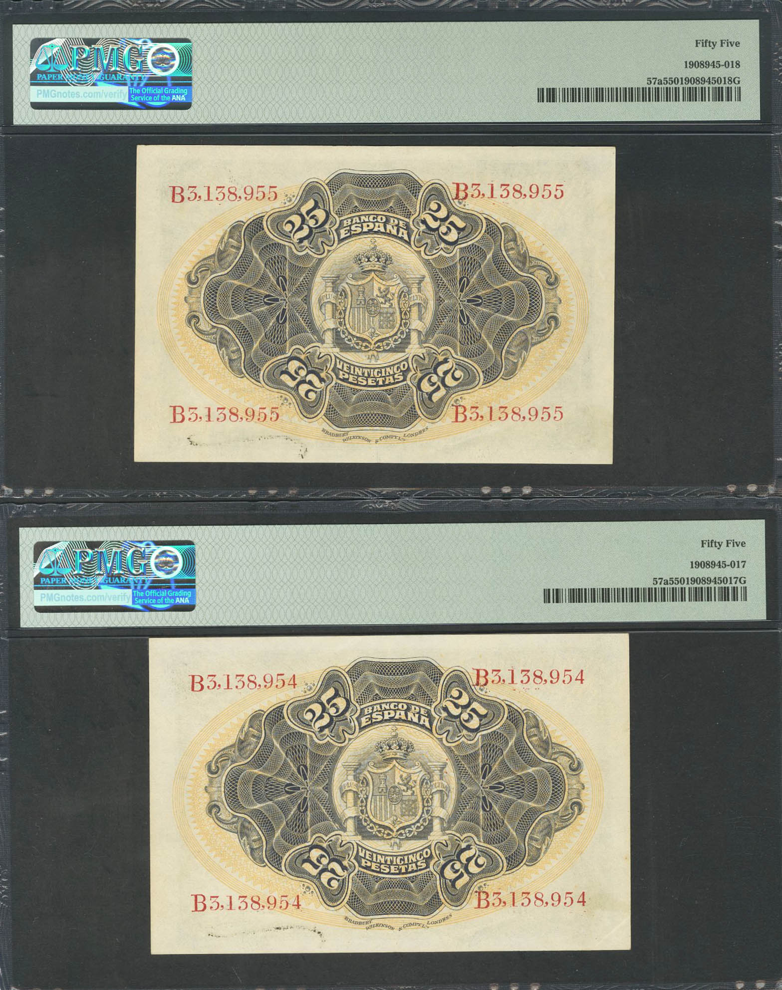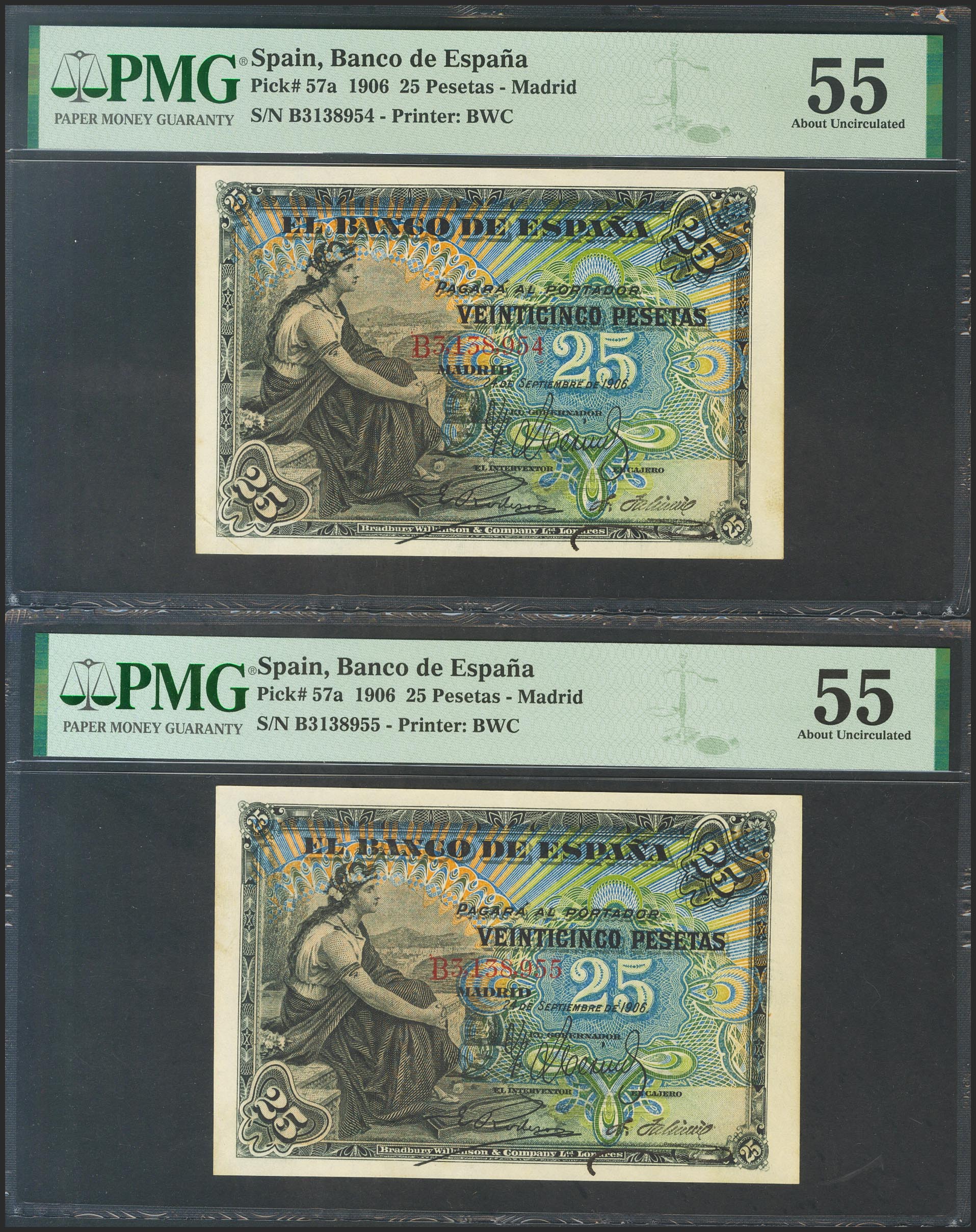 25 Pesetas. 24 de Septiembre de 1906. Pareja correlativa. Serie B. (Edifil 2017: 314a). Rara. EBC+. Encapsulados PMG55, ambos.