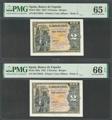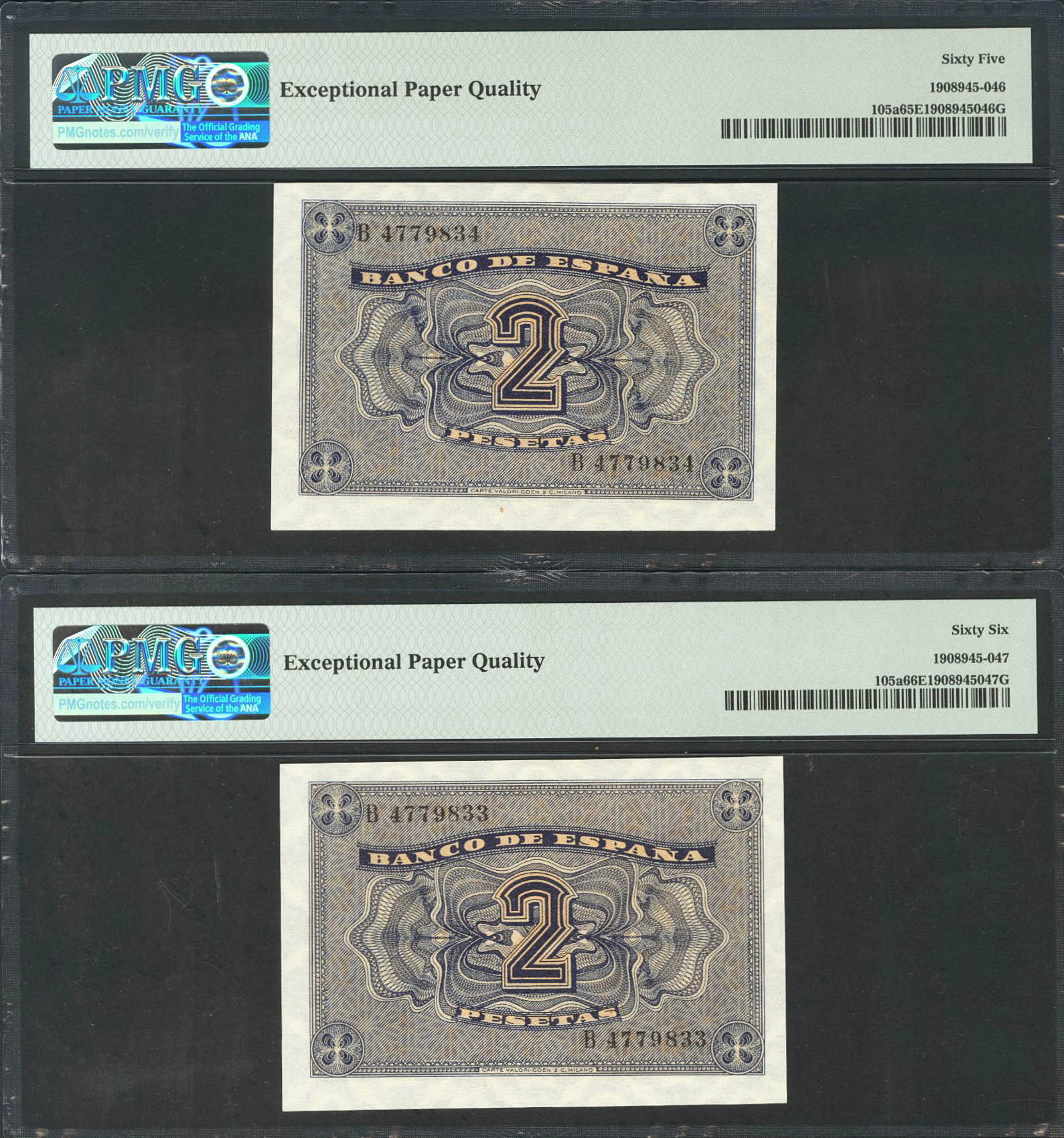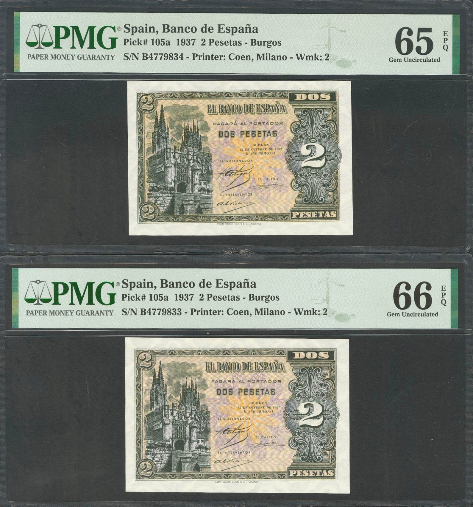 2 Pesetas. 12 de Octubre de 1937. Banco de España, Burgos. Pareja correlativa. Serie B. (Edifil 2017: 426a). Apresto original, muy rara. SC. Encapsulados PMG65EPQ/66EPQ.