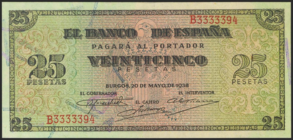 25 Pesetas. 20 de Mayo de 1938. Serie B. (Edifil 2017: 430a). Apresto original. SC-.