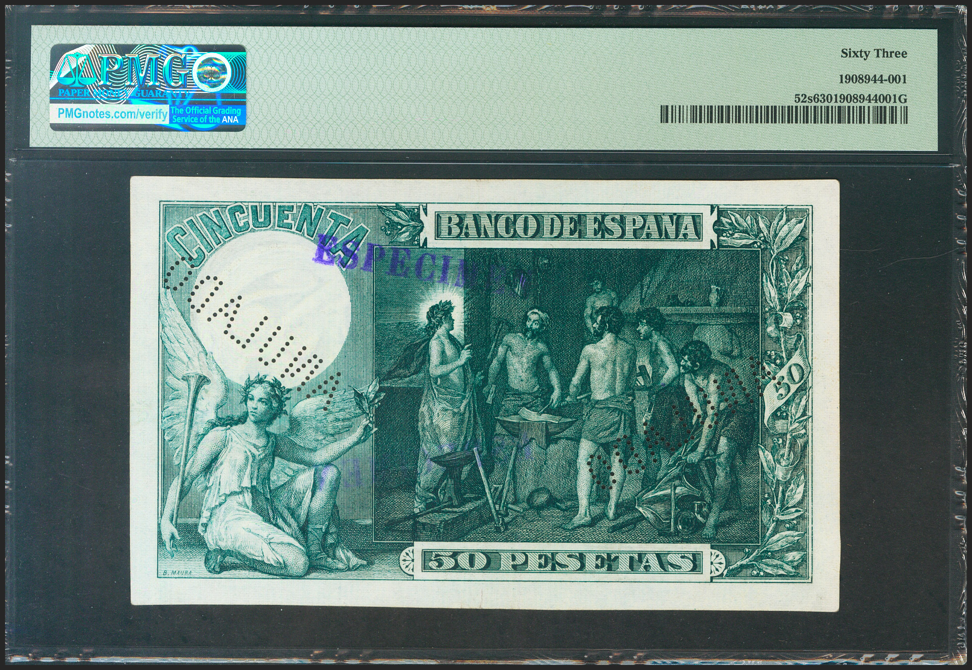 Prueba (anverso y reverso) del billete de 50 Pesetas emitido el 30 de Noviembre de 1902. Perforación ANULADO, marca ESPECIMEN y sin la firma del cajero. (Edifil 2021: 309P). RarÃsimo. SC-. Encapsulado PMG63.