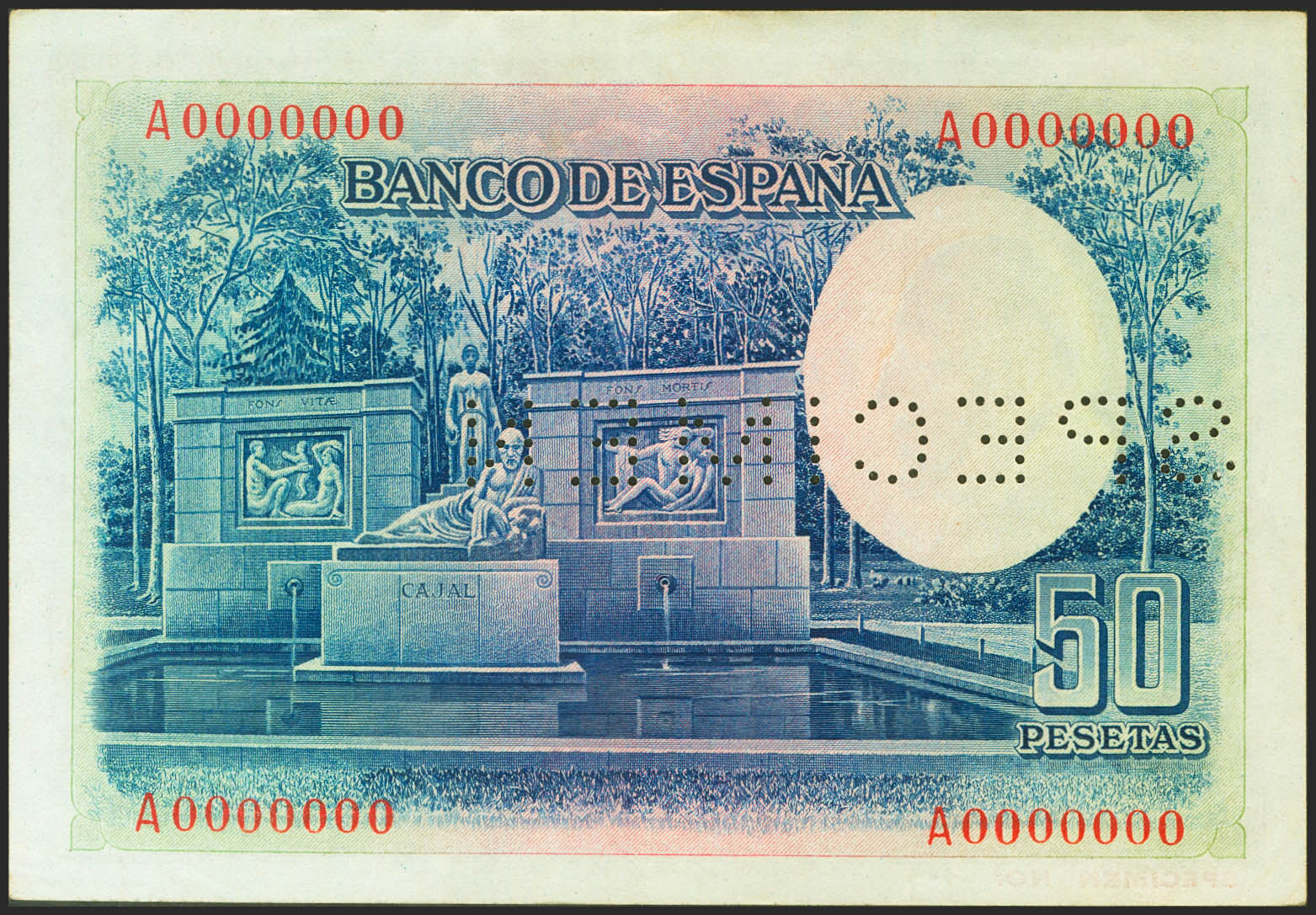 50 Pesetas. 22 de Julio de 1935. Serie A, numeración 0.000.000, taladro "SPECIMEN" y sin firma del cajero, con numeración 11, son muy raros los especímenes numerados, normalmente para autoridades de alto rango. (Edifil 2021: 366M). Muy raro, conserva todo su apresto original. EBC+.