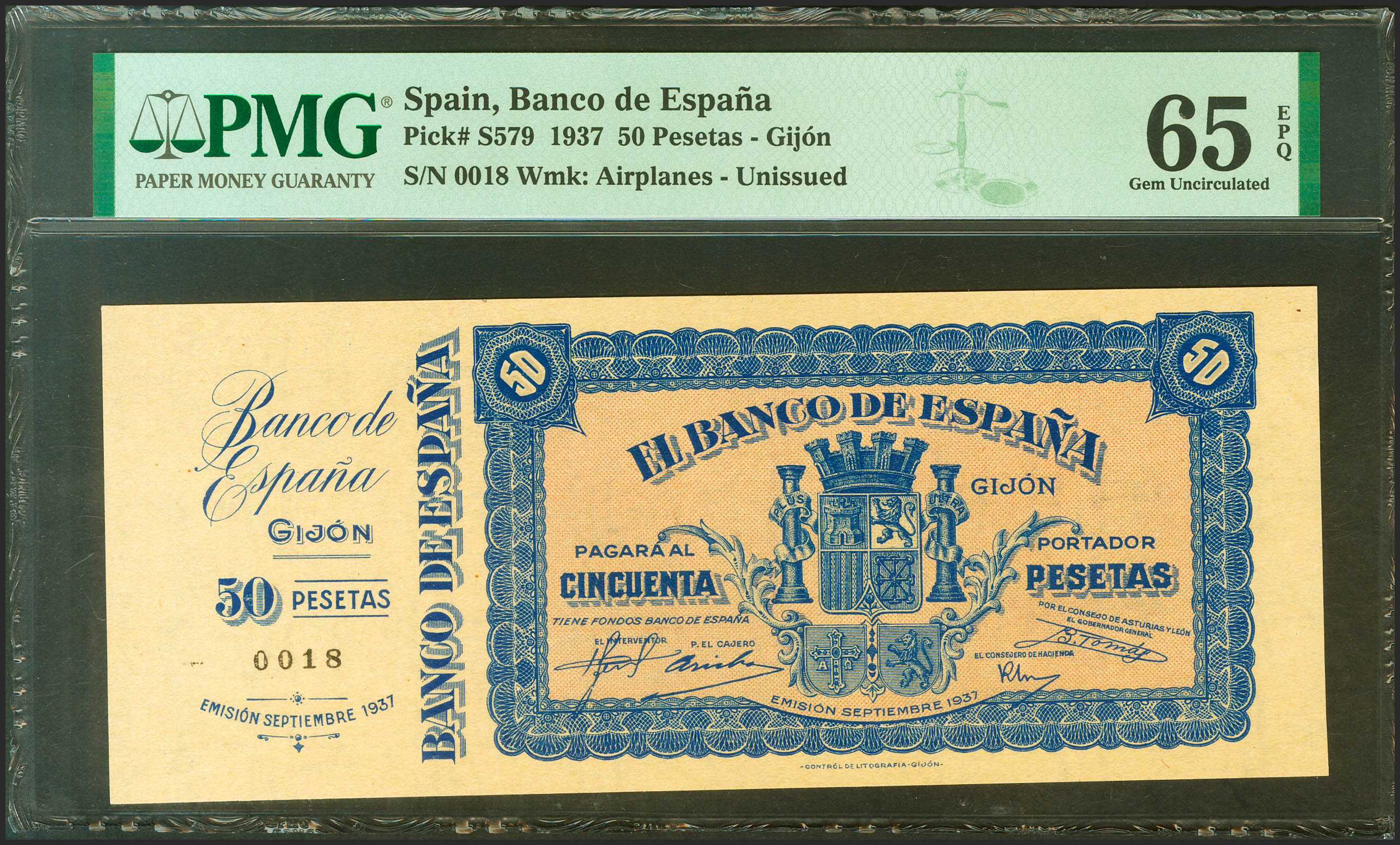 50 Pesetas NO EMITIDO. Septiembre 1937. Banco de España, Gijón. Sin serie, con matriz a la izquierda y numerado para su uso. (Edifil 2021: NE33, Pick: S579). Apresto original. SC. PMG65EPQ. Debido a la imposibilidad de los envÃos del Gobierno Central, imposibilidad provocada por un férreo control marÃtimo en el Cantábrico, PaÃs Vasco y Santander al estar liderada por el bando nacional, el consejo de Asturias experimentó contratiempos por falta de billetaje. Tras esta situación, se preceptúa la producción de billetes con fechas de septiembre de 1937 frente a la prohibición estatal. La emisión prevista estaba compuesta por tres billetes de 25, 50 y 100 Pesetas, de los cuáles solo se puso en circulación el de 100 Pesetas y sólo durante 14 dÃas. Estos billetes fueron diseñados por Germán Horacio Robles, junto con sus marcas al agua en litografÃa, en el barrio de Natahoyo en Gijón. Aquellos con valor de 50 o 100 Pesetas, están firmados por Belarmino Tomás (Gobernador del Consejo de Asturias y León) y por Rafael Fernández (Consejero de Hacienda), por esta razón son conocidos como "Belarminos". Para hacernos una idea de la rareza del billete de 50 Pesetas plasmamos literalmente una referencia del experto Ramón Cobo Huici, en Numismático Digital: "Estos billetes de 50 pesetas se pueden hallar con y sin la matriz cortada, existiendo un número aproximadamente igual de ejemplares en las dos condiciones, unos 96 ejemplares en total. También se pueden encontrar escasÃsimos ejemplares en pareja vertical, sin separar" La emisión no llegó a completarse por la caÃda de Gijón en manos nacionales.Fuente: Ramón Cobo Huici. Antonio Amat, Enciclopedia de billetes de España. Inés Montes, La Nueva España.