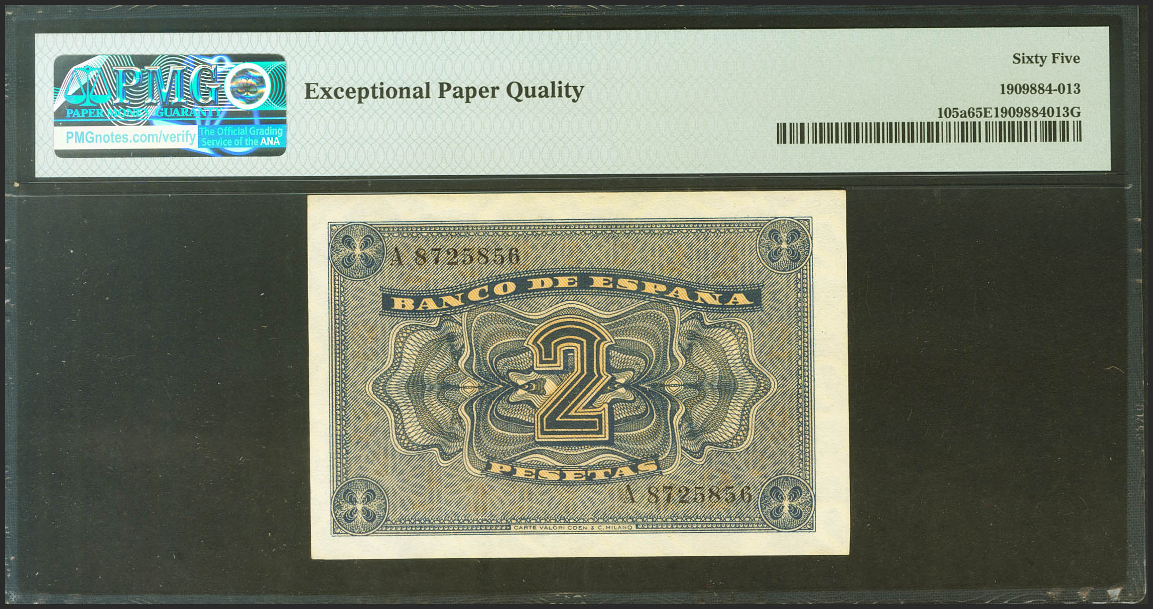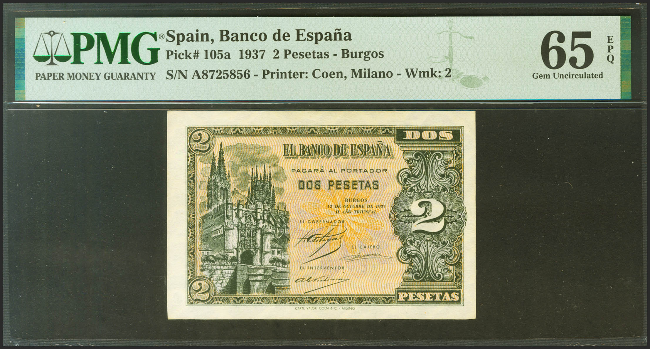 2 Pesetas. 12 de Octubre de 1937. Serie A. (Edifil 2021: 426, Pick: 105a). Raro, especialmente en esta calidad, apresto original. SC. Encapsulado PMG65EPQ.