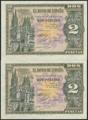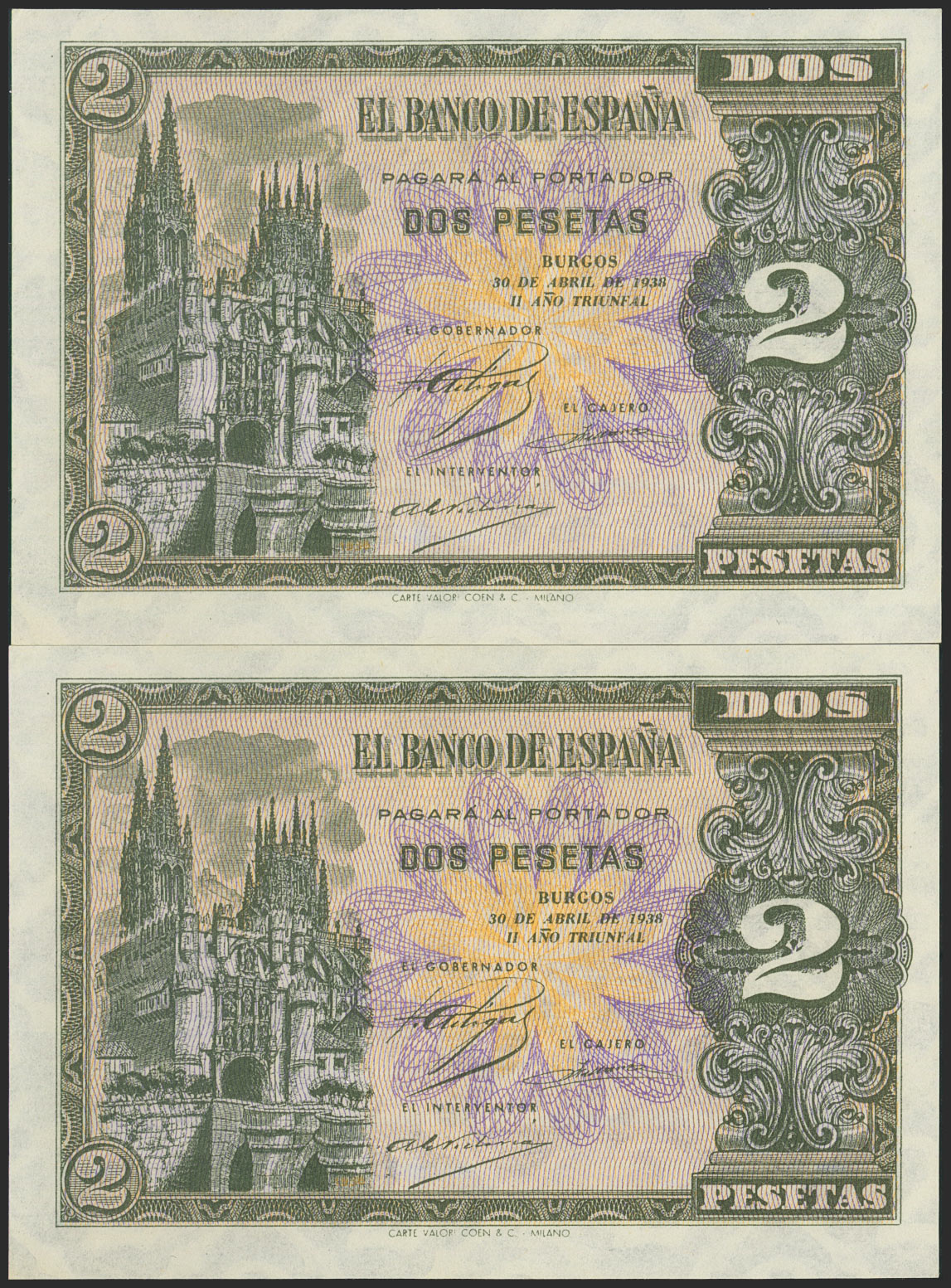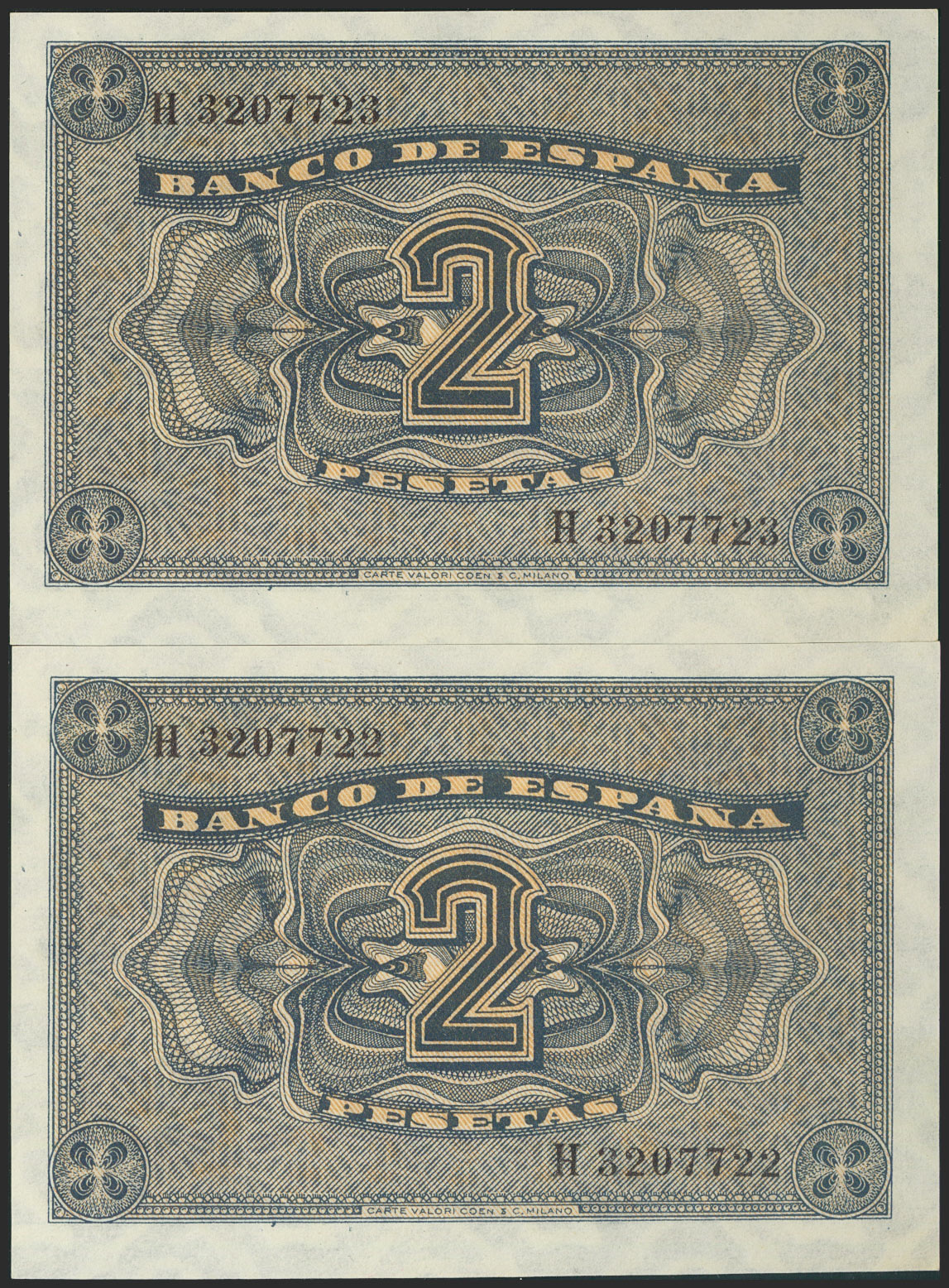 2 Pesetas. 30 de Abril de 1938. Pareja correlativa. Serie H. (Edifil 2021: 429a). Conserva todo su apresto original. SC.