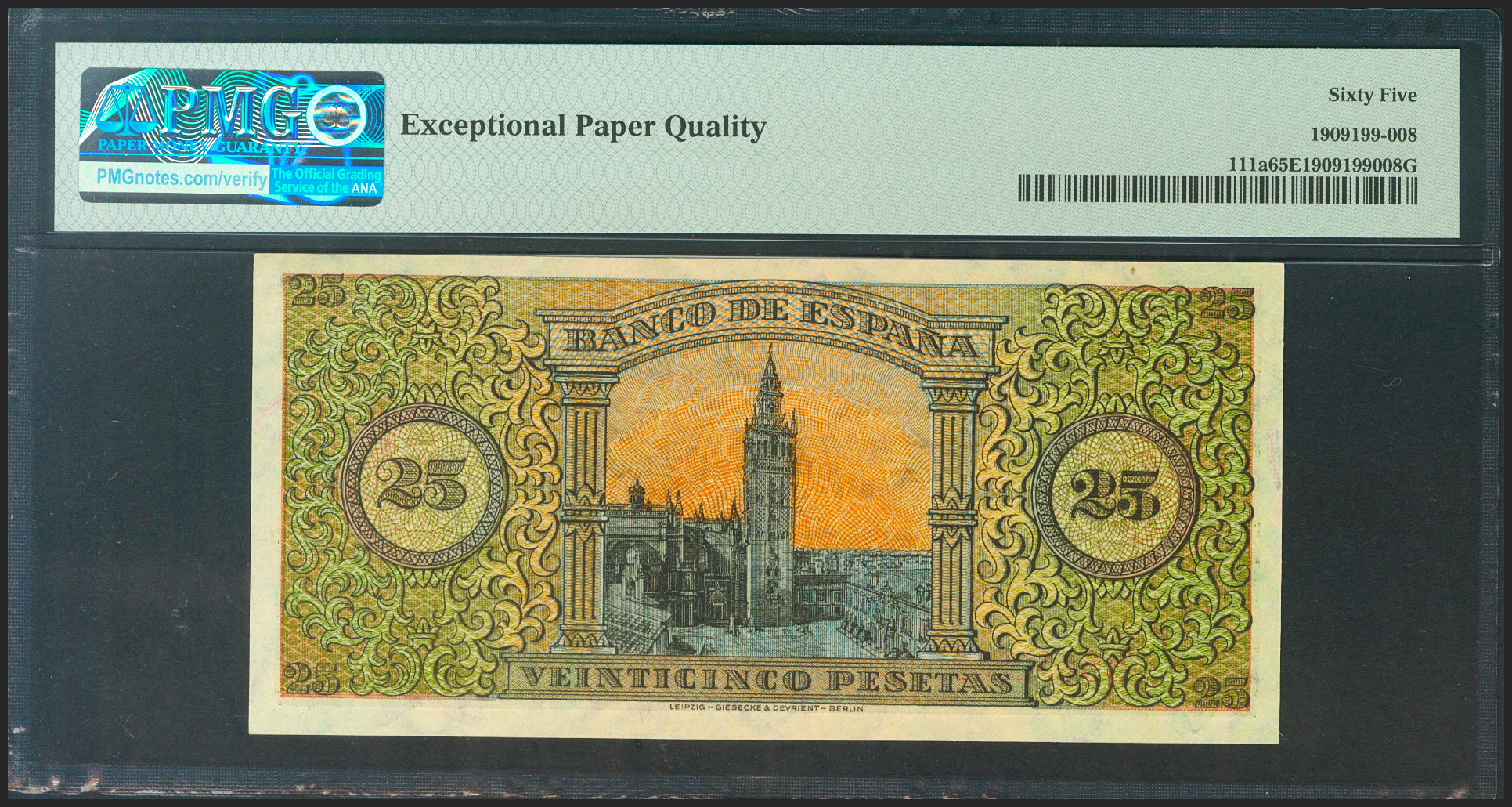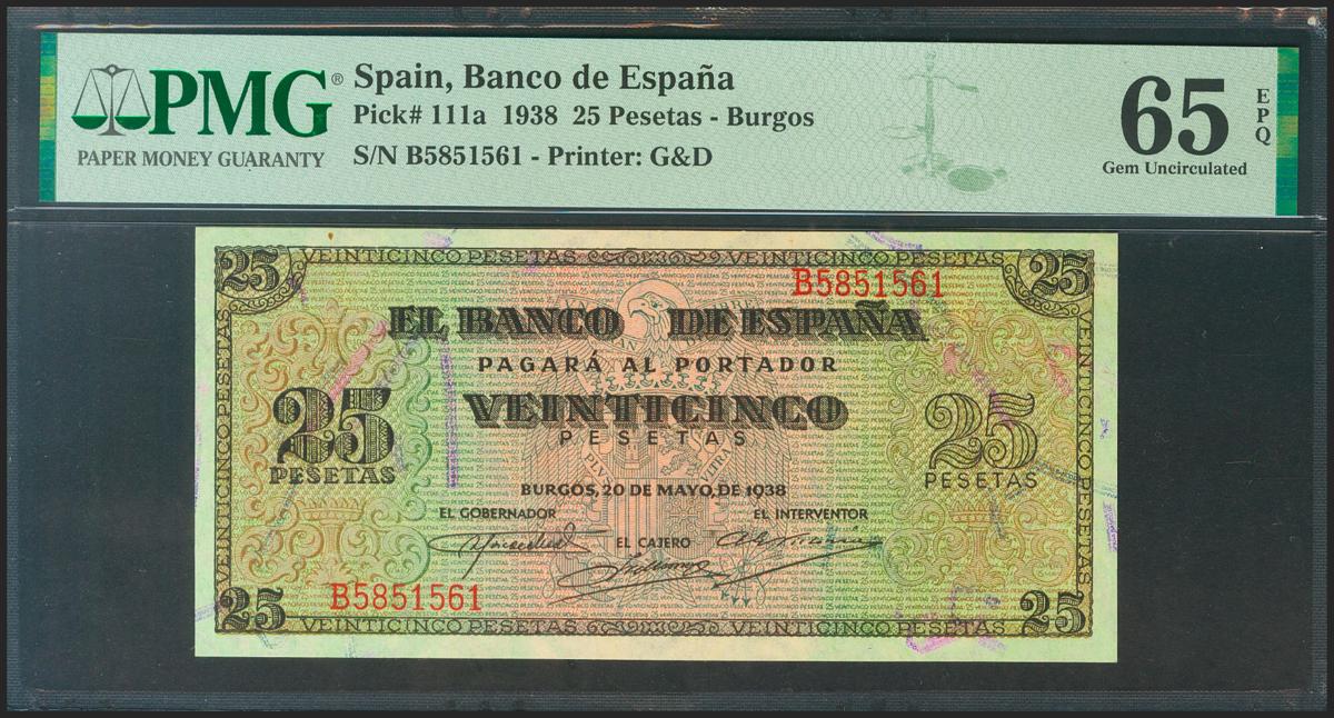 25 Pesetas. 20 de Mayo de 1938. Serie B. (Edifil 2021: 430a, Pick: 111a). Inusual en esta calidad, apresto original. SC. Encapsulado PMG65EPQ.