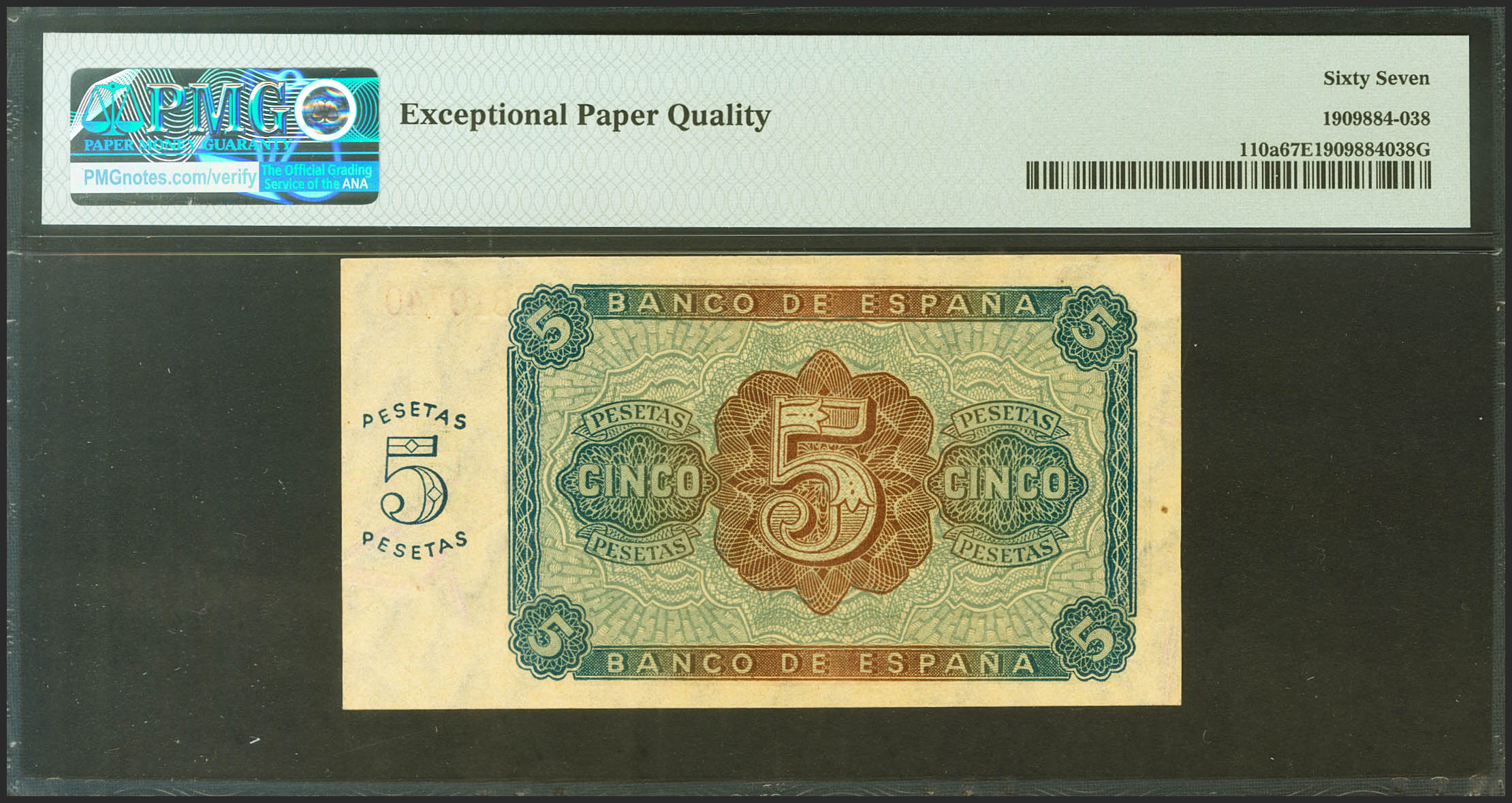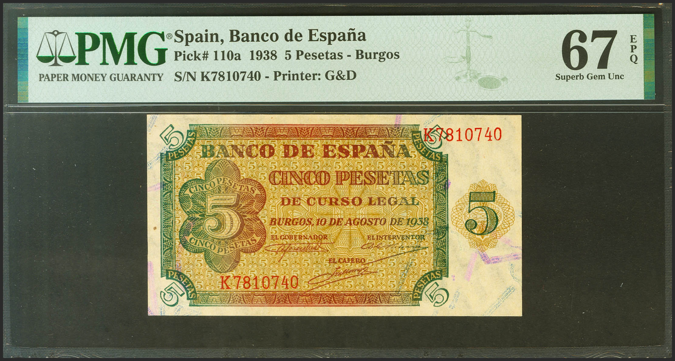 5 Pesetas. 10 de Agosto de 1938. Serie K. (Edifil 2021: 435a, Pick: 110a). Raro en esta excepcional calidad, apresto original. SC. Encapsulado PMG67EPQ.