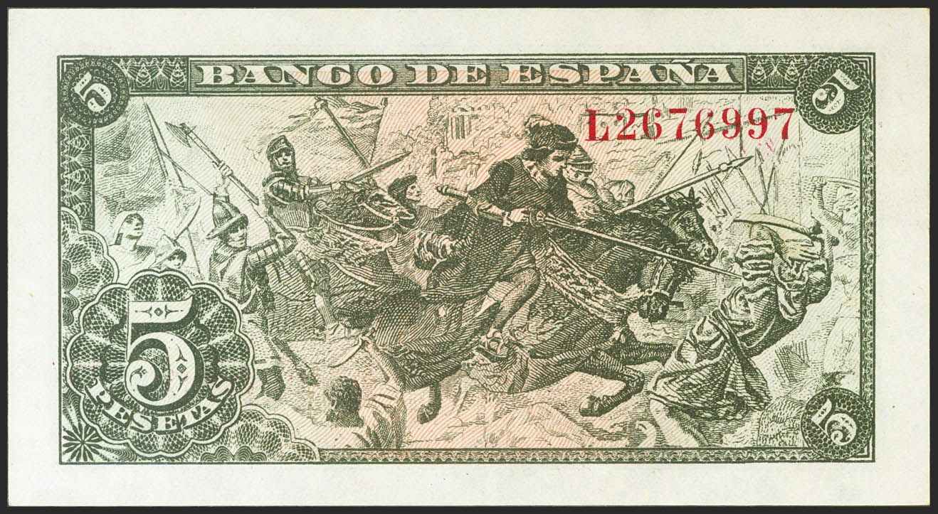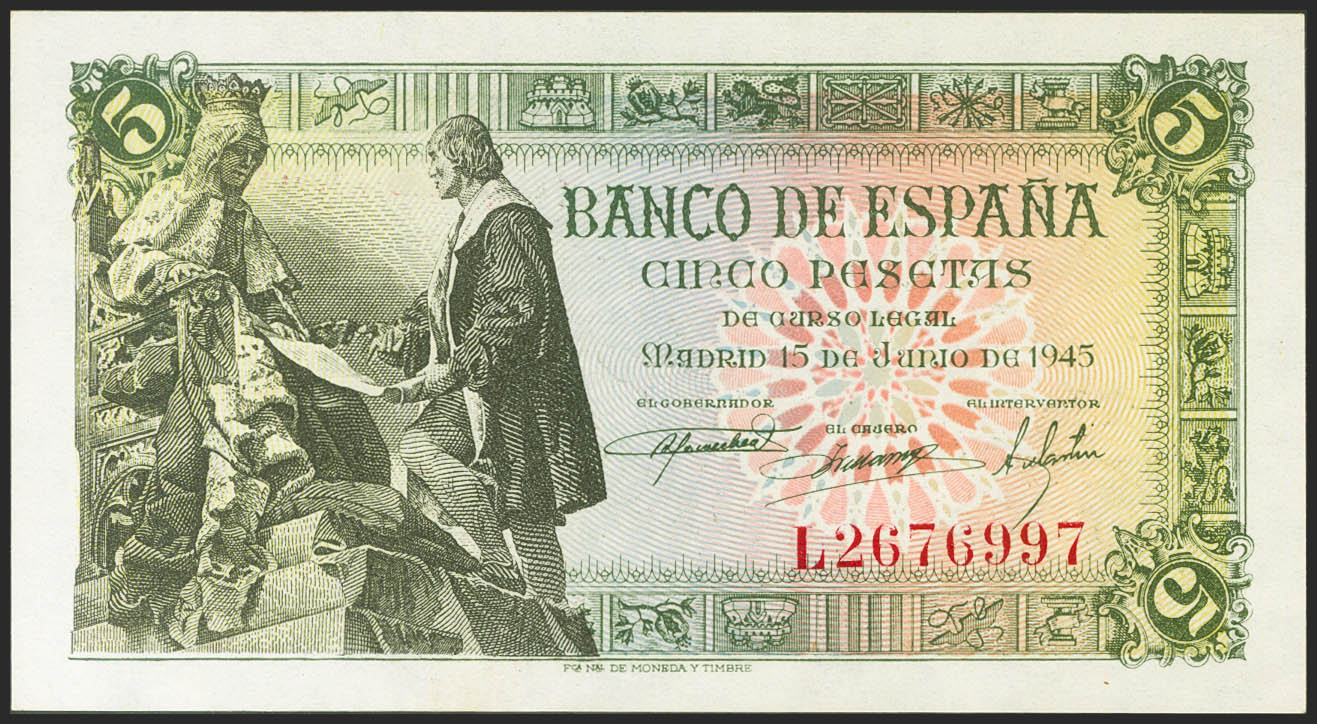 5 Pesetas. 15 de Junio de 1945. Serie L, última serie emitida. (Edifil 2021: 449a). Raro, apresto original. SC-.